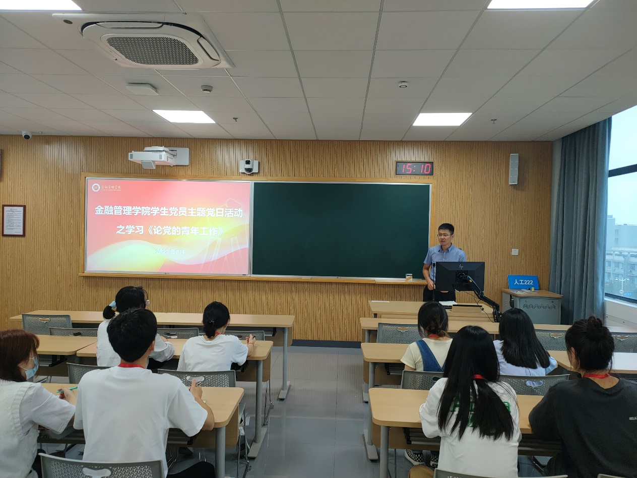 《论党的青年工作》是我们党的领袖关于青年工作最全面、最系统的论著,是全国广大团员青年和青年工作者在共青团成立一百周年之际收到的珍贵礼物,为全党全社会深入学习贯彻习近平总书记关于青年工作的重要思想提供了根本遵循。9月28日下午三点,金融管理学院学工办宋春旗老师带领金融第二党支部的学生党员在泰隆507教室《论党的青年工作》进行学习。