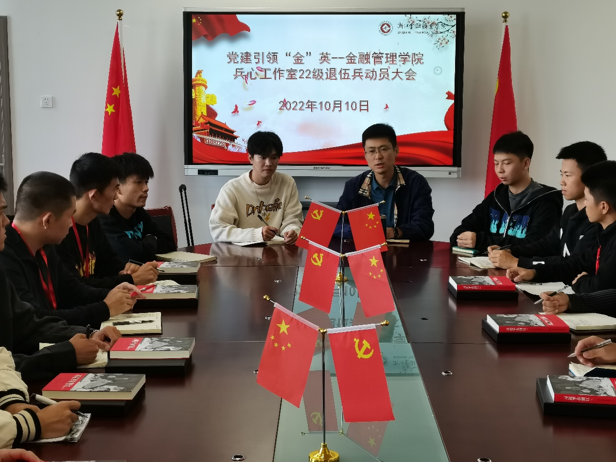 10月10日下午,金融管理学院兵心工作室在泰隆大厦召开22级退役士兵大学生动员大会,金融管理学院团总支书记、学工办副主任宋春旗老师,兵心工作室代表以及22级全体退役士兵大学生参加本次会议。