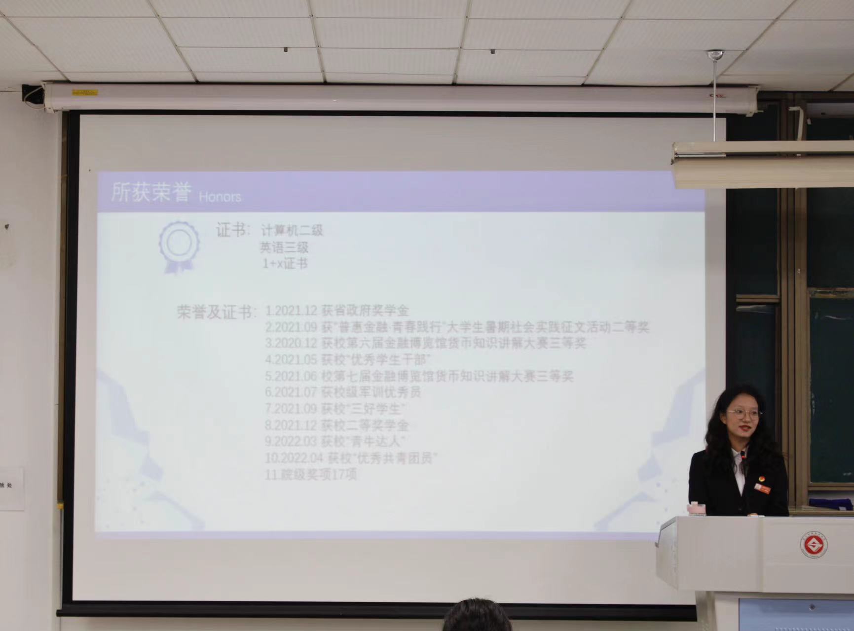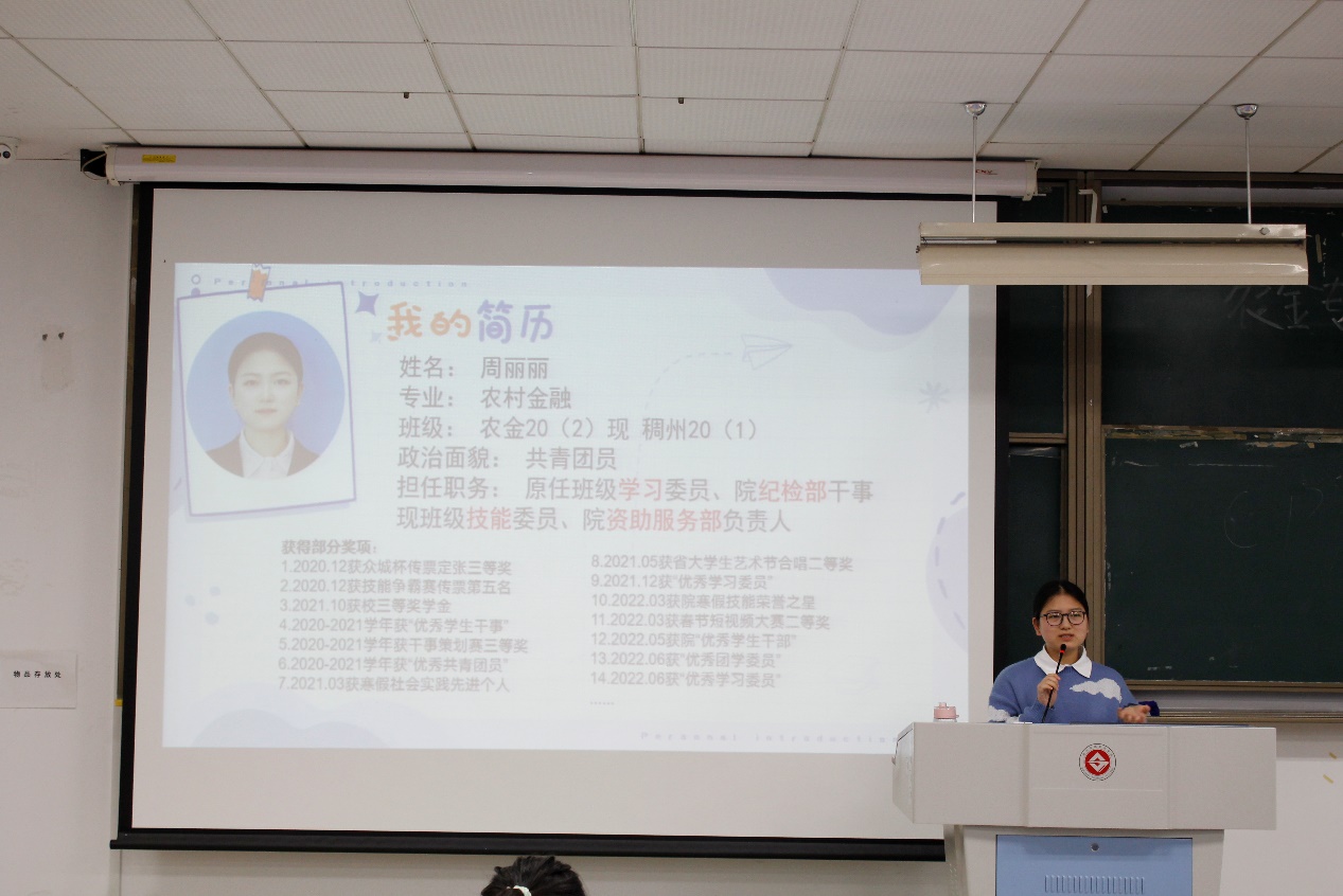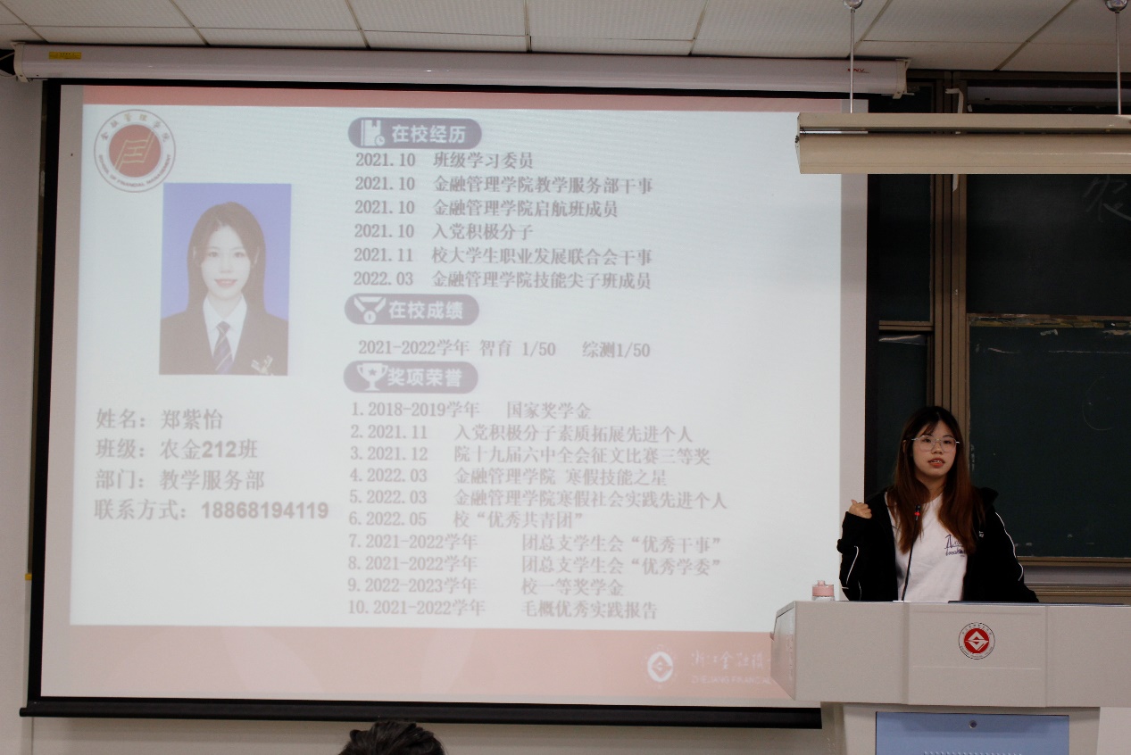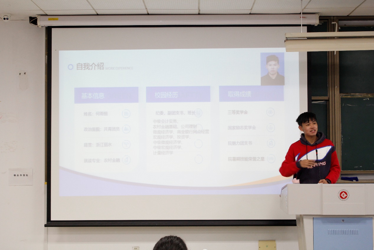 农金211班黎世杰从技能和参与活动两方面分享了自己的经验,希望同学们抓紧时间练技能,要用心去记,多打多练。同时,要丰富校园生活,锻炼自己的为人处世能力。