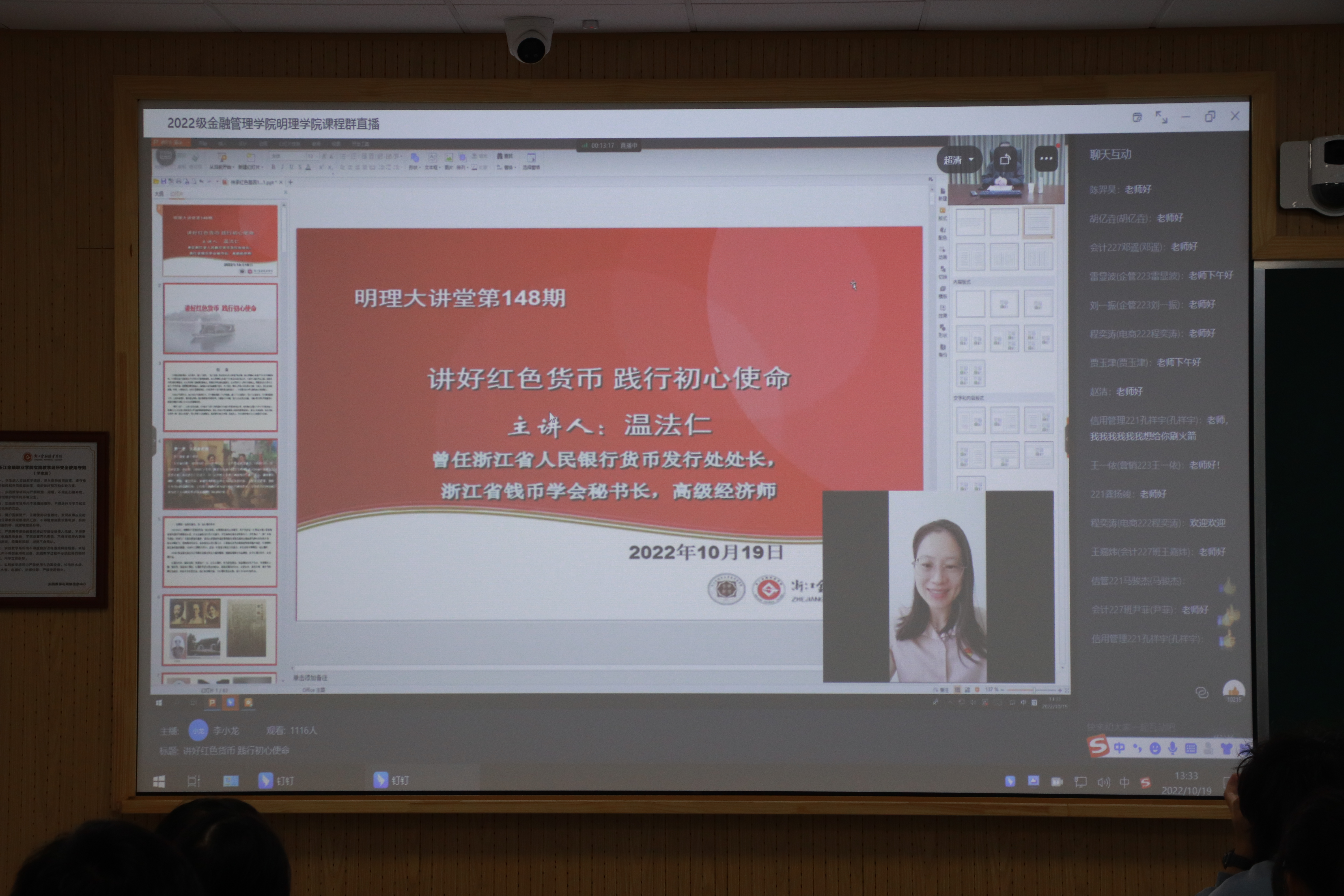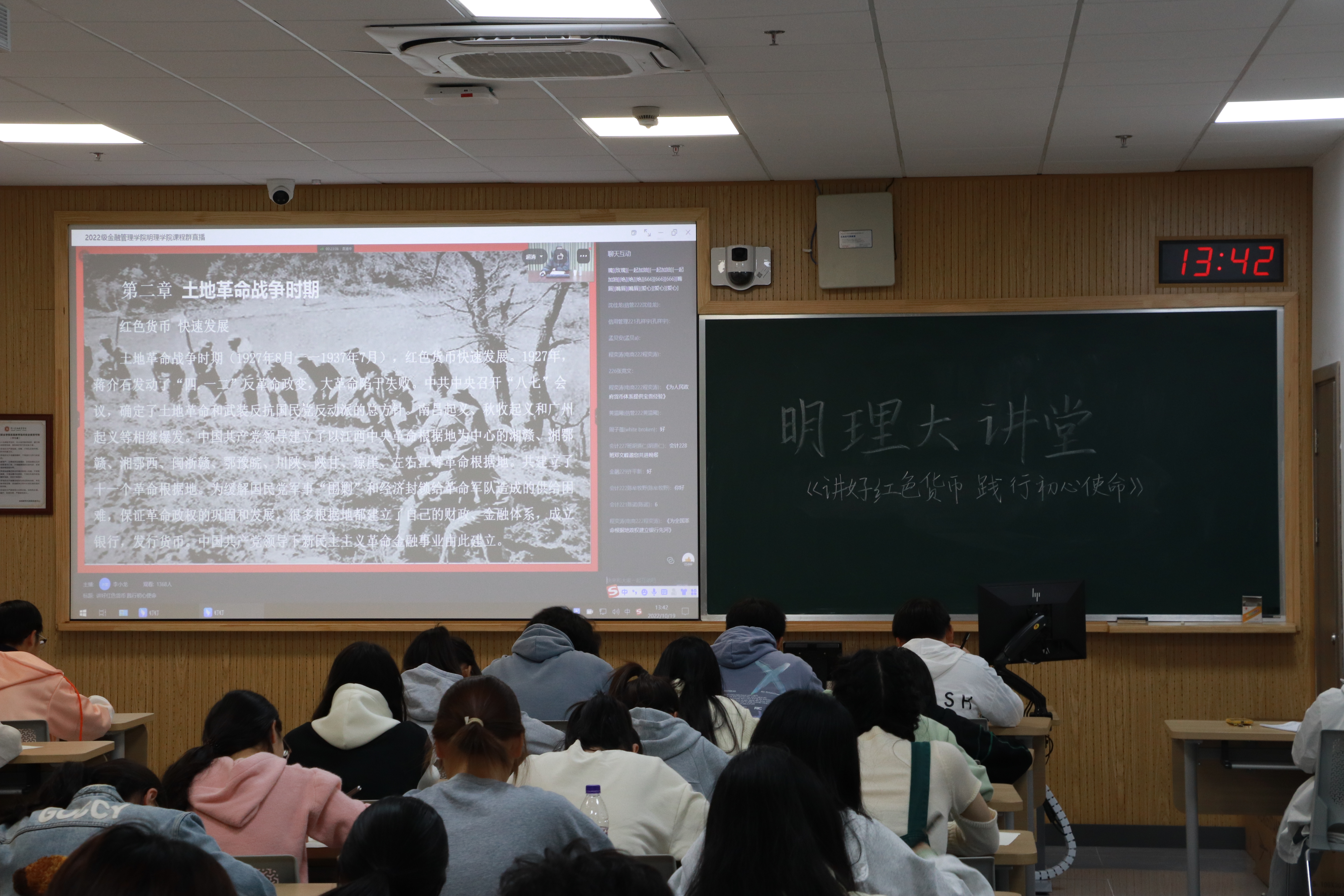 以货币为媒介,追寻红色足迹。为传承红色精神,遥忆辉煌历史,金融管理学院于10月19日下午13:30在泰隆大厦109教室集中观看线上“讲好红色货币,践行初心使命”明理大讲堂。22级全体新生参与此次活动,特邀曾任浙江省人民银行货币发行处处长、省钱币学会秘书长、高级经济师温法仁作为主讲人,讲座由明理学院教师杜鹃主持。