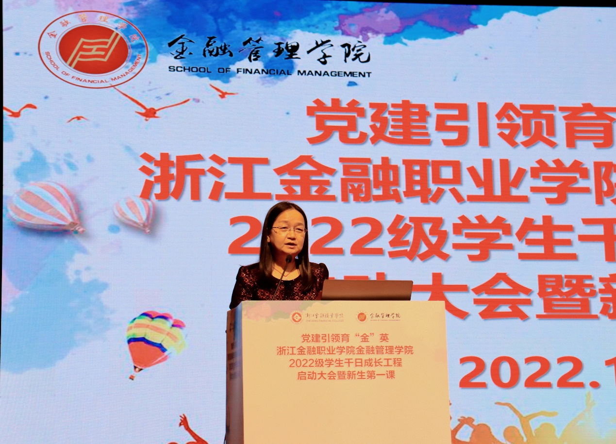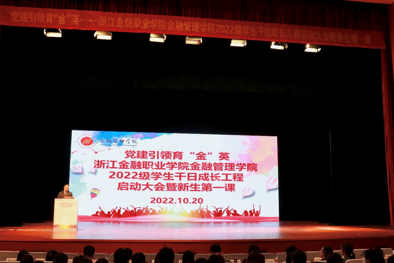 金融管理学院于10月20日下午在金葵花艺术中心召开“党建引领育‘金’英”2022级学生千日成长工程启动大会暨新生第一课。出席本次活动的有浙江金融职业学院党委委员、副校长郭福春,金融管理学院院长董瑞丽,学院党总支书记、副院长钱利安,学院党总支副书记、副院长吴金旺,学院副院长凌海波,学院党总支副书记吴小燕,学院各党支部书记、各专业教研室主任,校友代表,全体新生班主任,全体辅导员以及2022级全体新生参加此次活动。本次大会由凌海波主持。