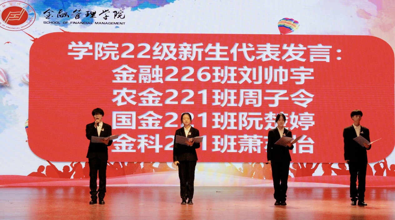 大会上,由金融226班刘帅宇、农金221班周子令、国金221班阮楚婷、金科221班萧苏怡四名同学作为新生代表发言。