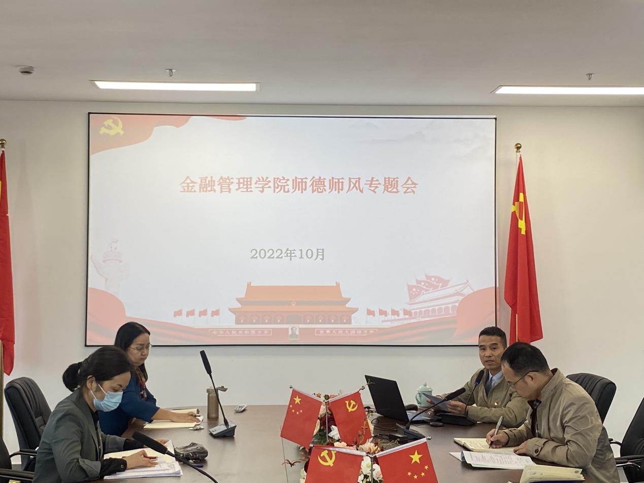 10月19 日下午,为进一步加强师德师风建设,树师表、正师风、铸师魂,切实提高教师的职业道德素养,金融管理学院召开师德师风专题会,金融管理学院院长董瑞丽,学院党总支书记、副院长钱利安,学院副院长凌海波,学院党总支副书记吴小燕以及学院全体教职工参加本次会议。本次会议由钱利安主持。