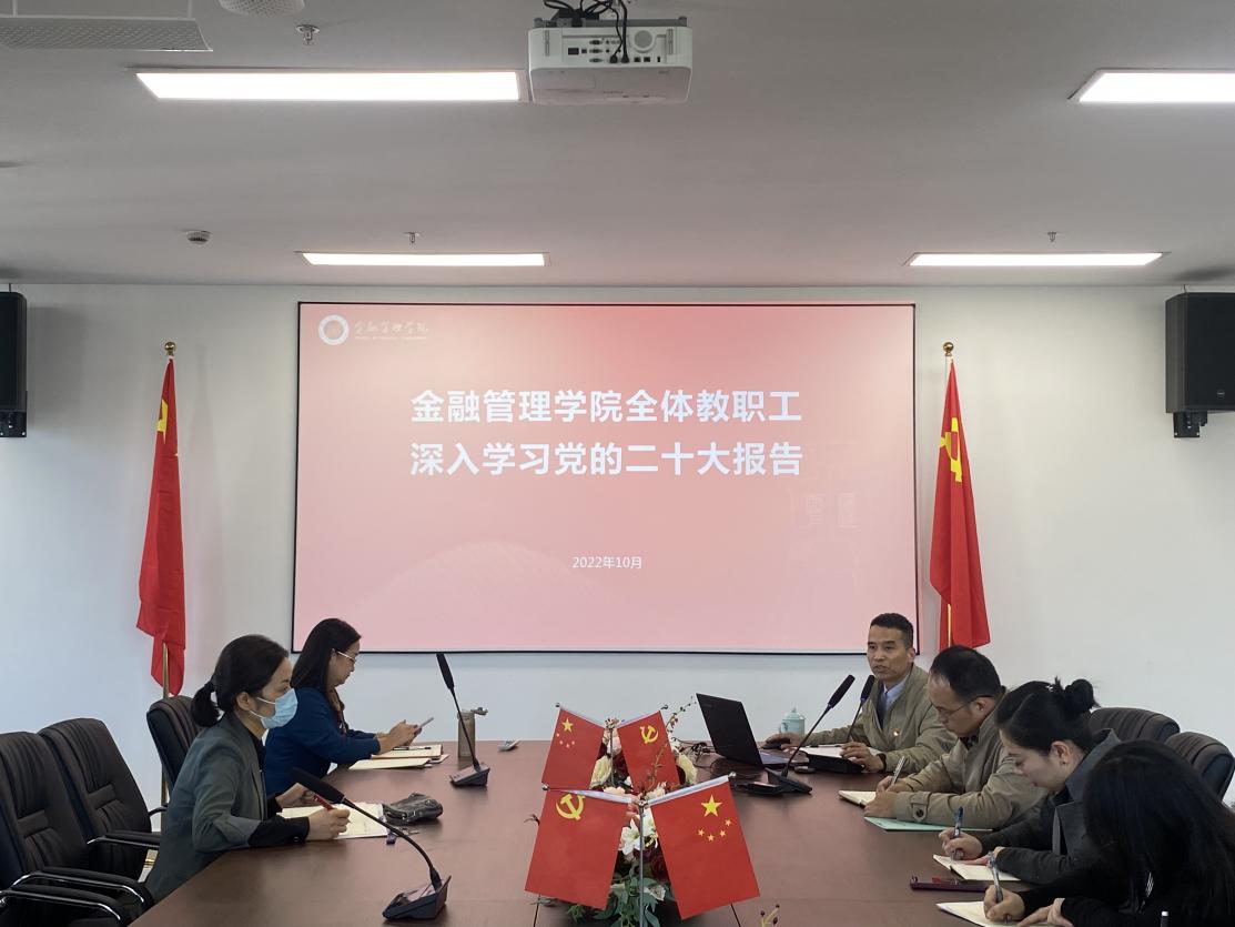 10月19日下午,金融管理学院党总支组织全体教职工在泰隆718会议室召开专题学习会议,深入学习习近平总书记在中国共产党第二十次全国代表大会上所作的报告,会议由金融管理学院党总支书记、副院长钱利安主持。