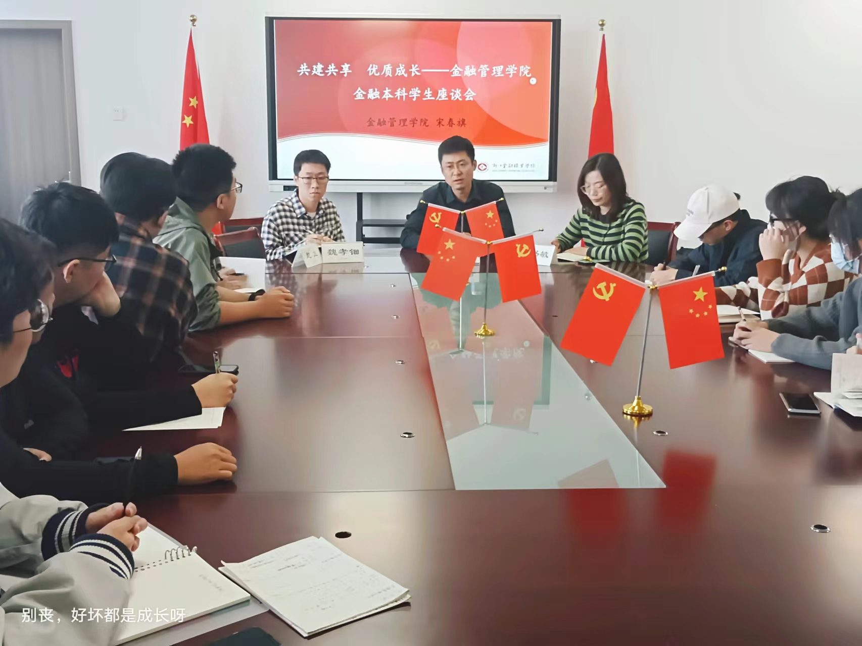 2022年10月24日上午,在泰隆大厦609会议室,共建共享 优质成长——学院召开联合办学金融学本科22级学生交流会。出席本次交流会:学院学工办副主任、团总支书记宋春旗老师、学工办石书敏老师、魏孝钿老师,联合培养金融学本科班主任赵兰老师以及金融学本科221全体班委。