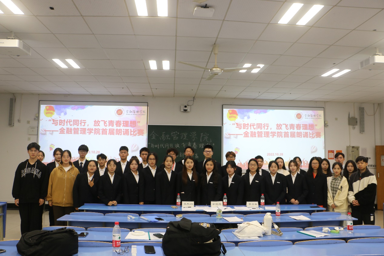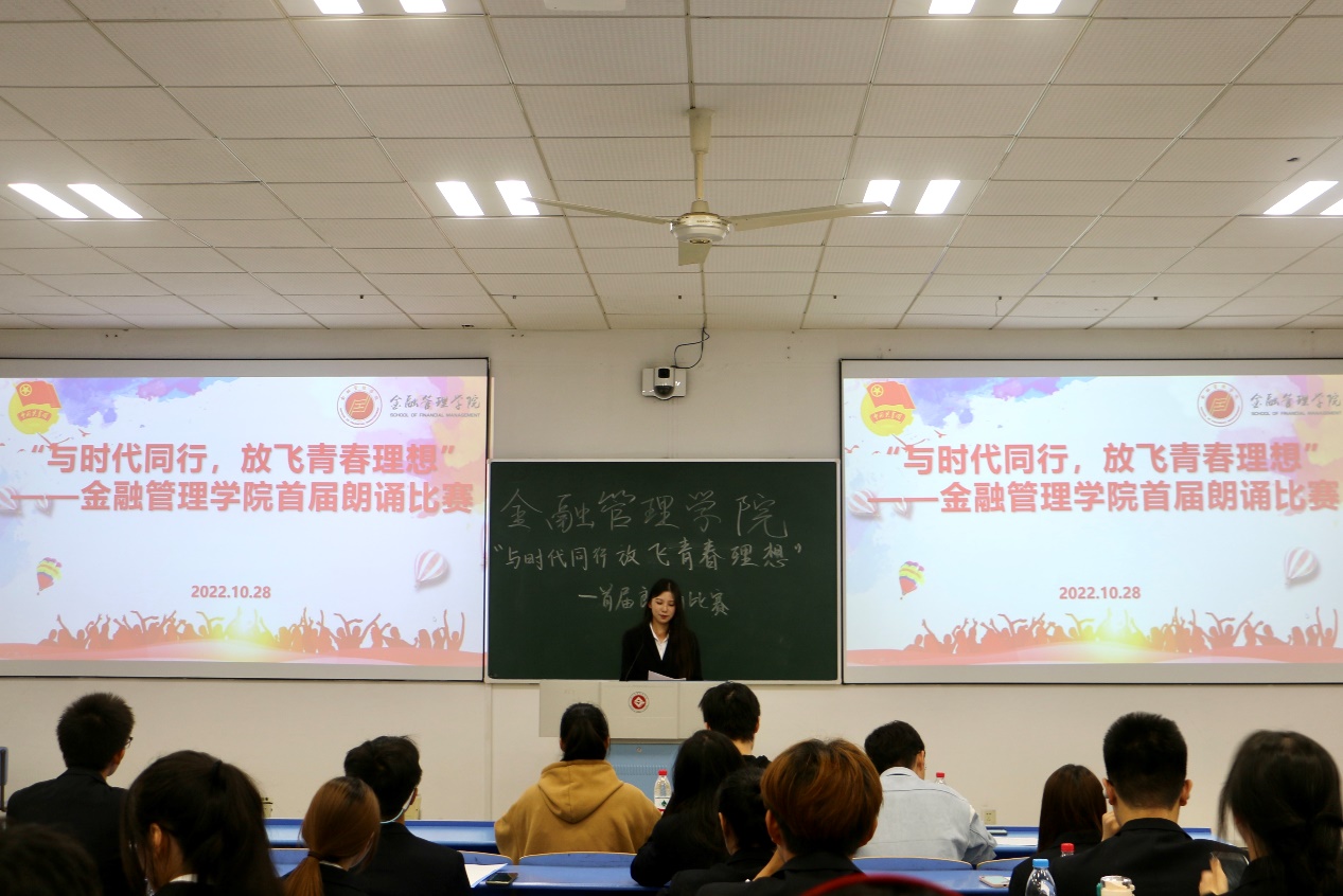 为让我院学子感受中华文化魅力,进一步展现青年在党的坚强领导下焕发出的时代风貌和人文精神。金融管理学院金融语言艺术团于10月28日晚在8219教室举行金融管理学院“与新时代同行,放飞青春理想”为主题的首届朗诵比赛。担任比赛评委嘉宾的有学院团总支副书记余继超、张秋韵,金融语言艺术团负责人曹彦卓。本次比赛由胡一涵主持。