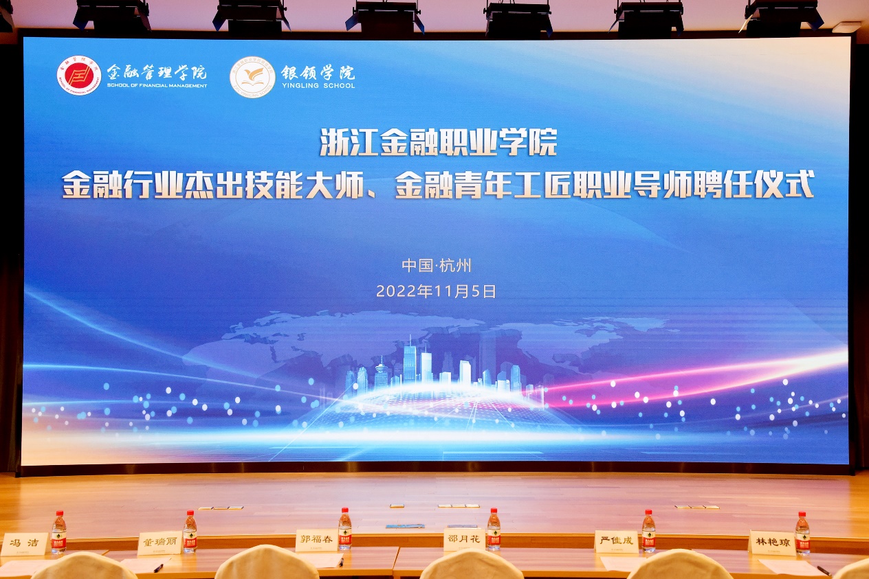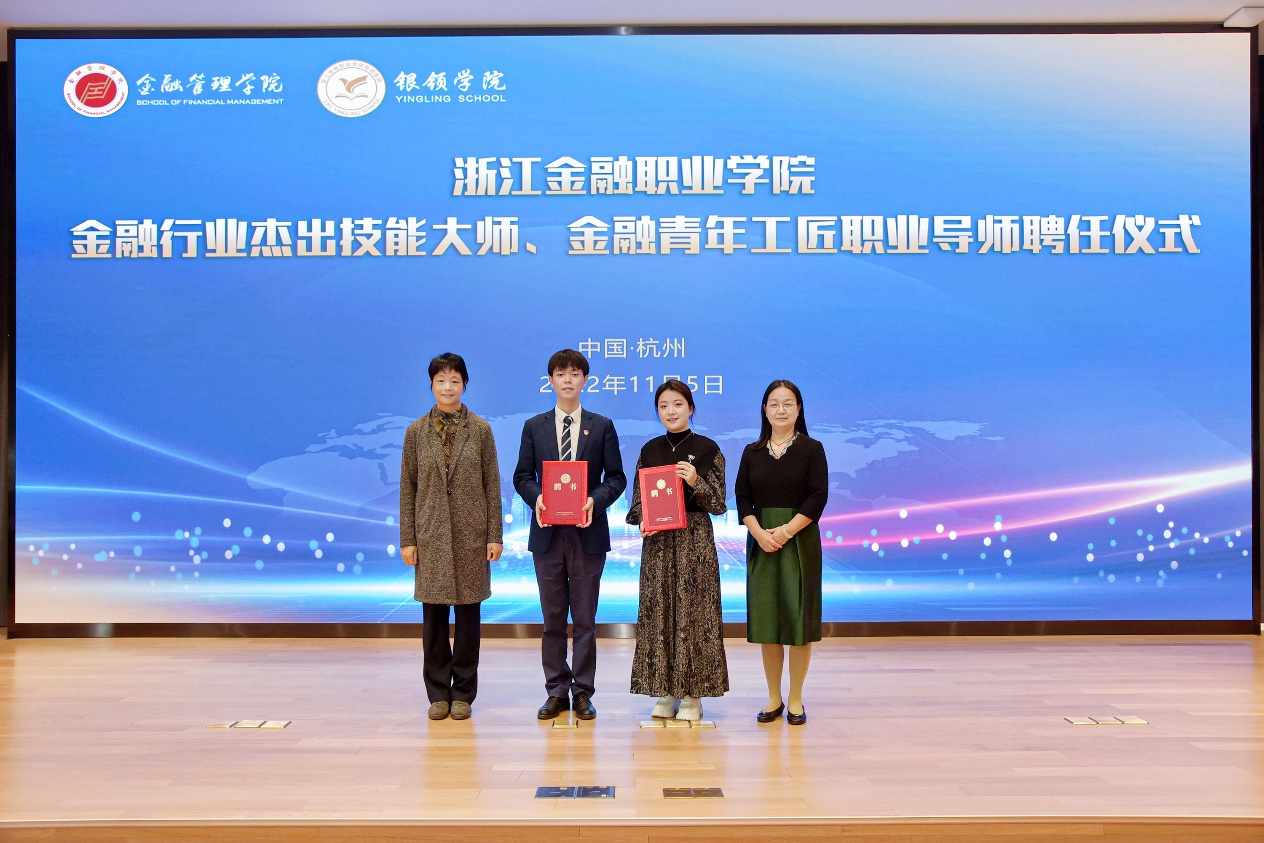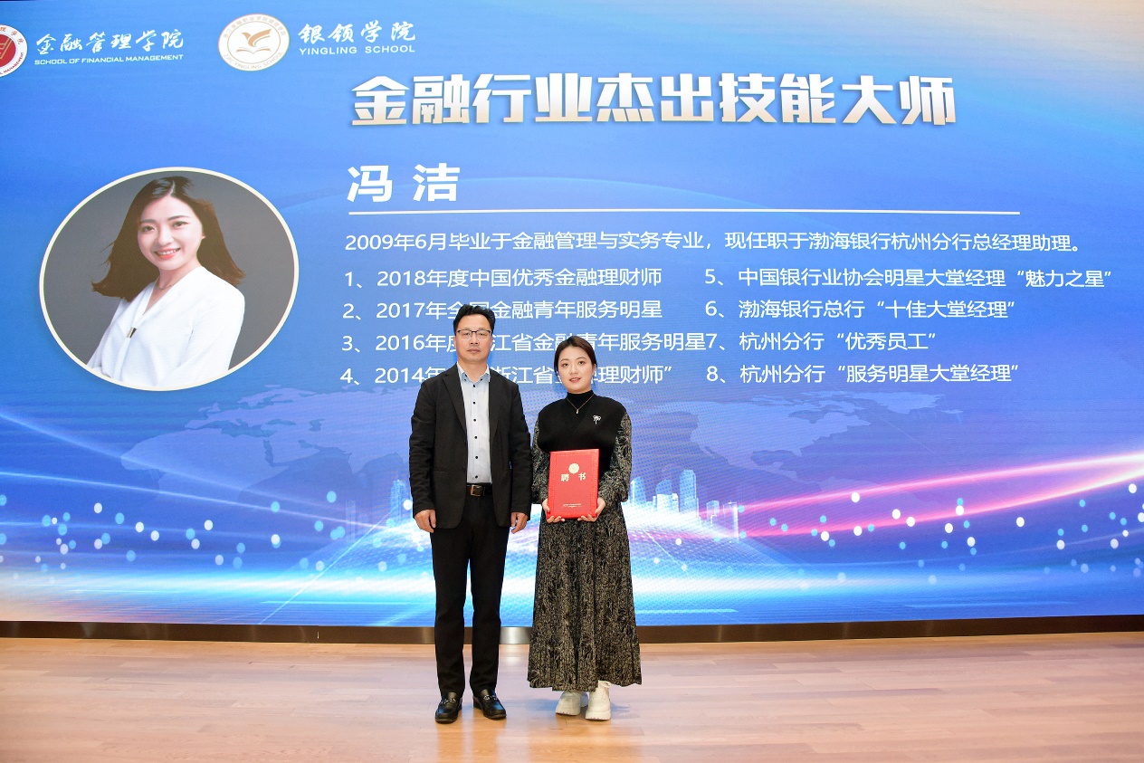 为认真贯彻、落实《国家职业教育改革实施方案》精神,引进金融机构的业务骨干和高级管理人员加入到专业群教学队伍,深入开展“大国工匠进校园”,提升人才培养质量,培育和传承好工匠精神。11月5日上午,我校金融行业杰出技能大师、金融青年工匠职业导师聘任仪式在泰隆报告厅隆重举行。学校副校长郭福春,杰出校友冯洁、严佳成出席了聘任仪式,金融管理学院院长董瑞丽,银领学院党总支书记、常务副院长邵月花,相关教师代表,金融管理学院与银领学院技能尖子班学生参加了仪式。