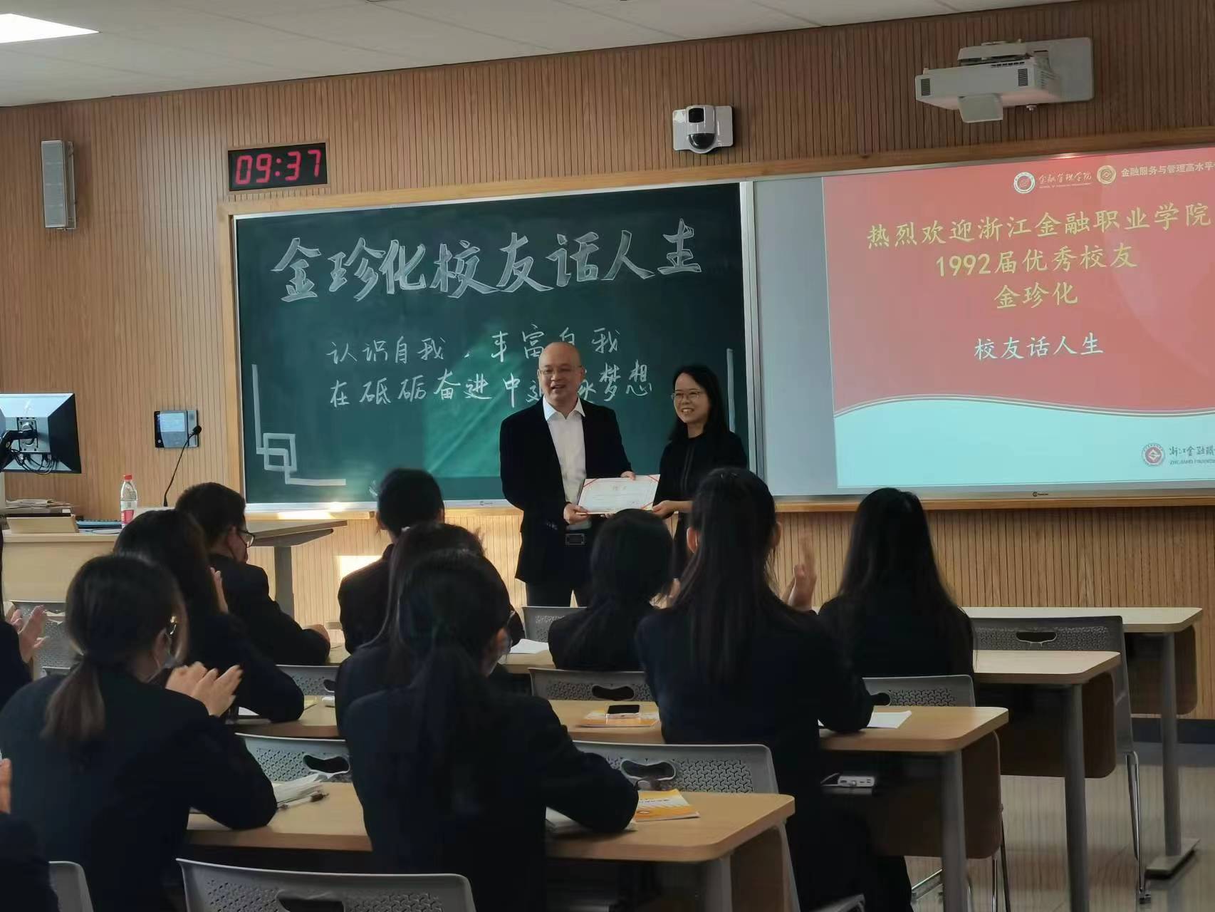 为让同学们进一步明确自己,发现自身的闪光点,11月5日,金融管理学院有幸邀请到学院优秀校友,现任中国工商银行龙港支行党总支书记、行长金珍化于泰隆301围绕“认识自我,丰富自我,在砥砺奋进中追逐梦想”开展校友话人生活动,向在校学子分享学习工作经验,学院学生参加本次活动。本场活动由金融服务与管理专业教研室主任邱俊如主持。