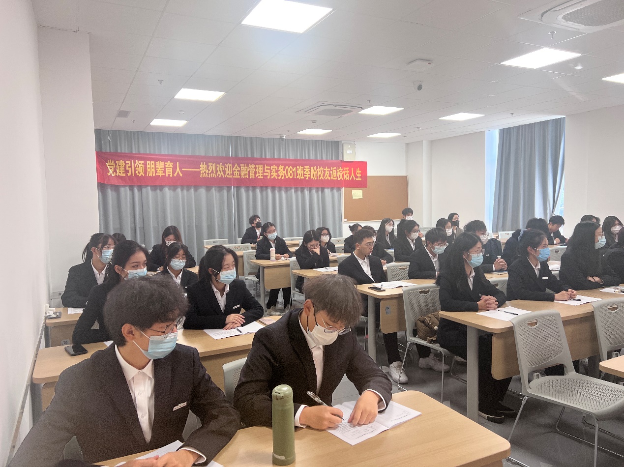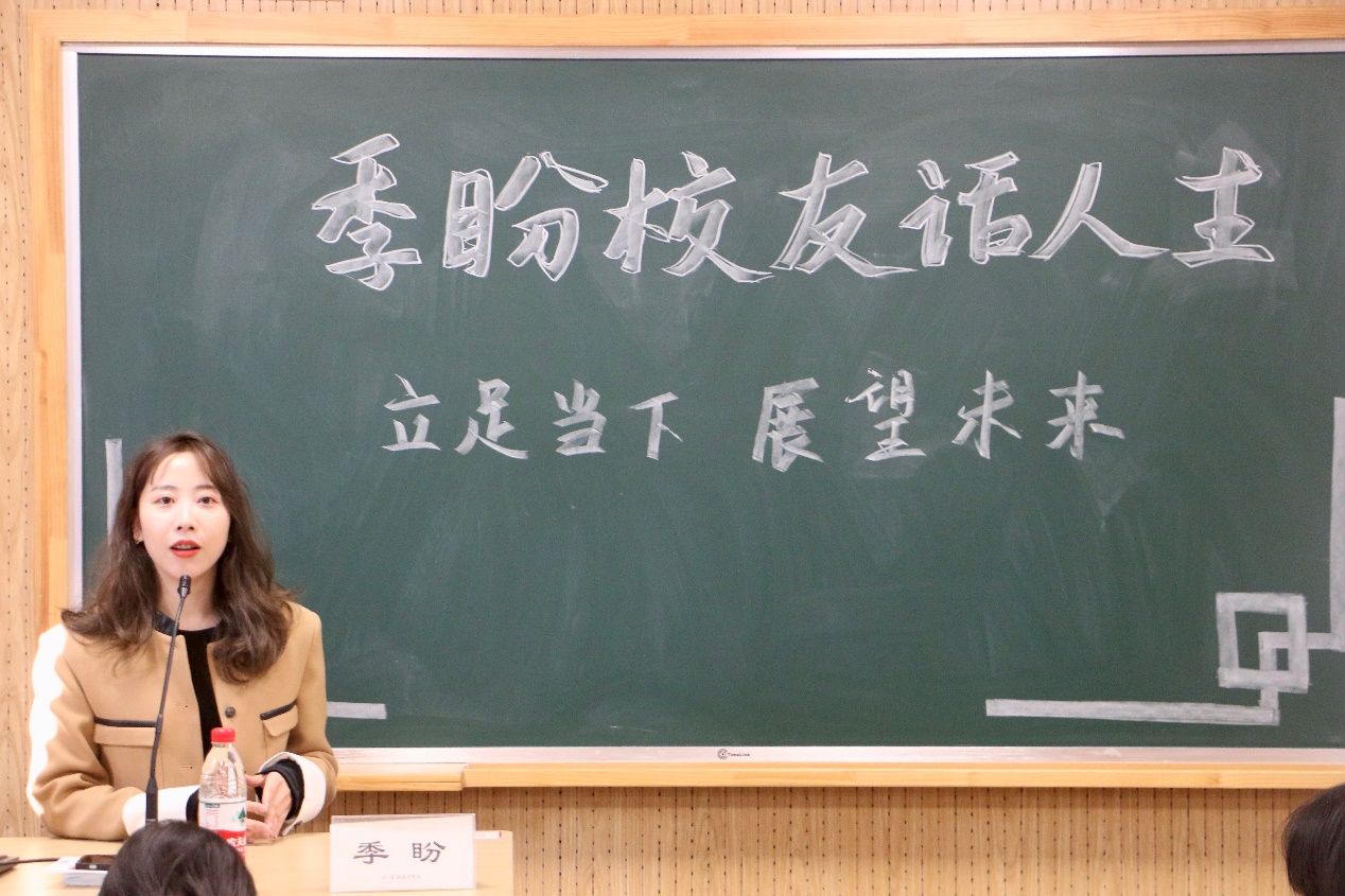 活动伊始,校友季盼结合自身求学与工作经历,并围绕自身“立足当下 展望未来”的人生态度,向金融学子展开分享。她提及学校是各位学子良好的成长平台,建议同学们在进入工作前做好明确规划,在进入工作后保持谨慎,恪尽职守,在岗位上摸索出适合自己的工作方式。