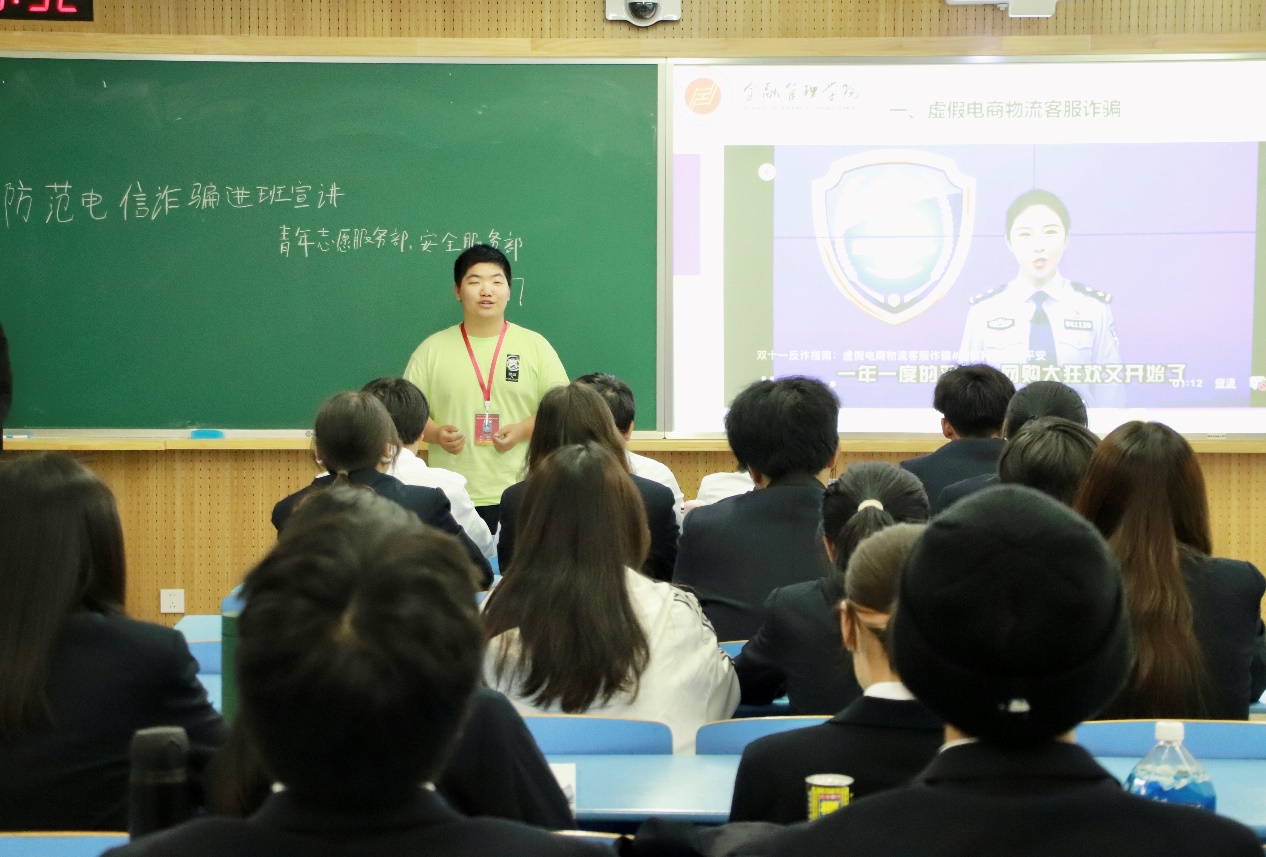 为防范校园电信诈骗,保障学生财产安全,维护校园和谐稳定。金融管理学院青年志愿服务部和安全服务部,于11月7日晚在大一各班晚自习教室组织开展防范电信诈骗志愿活动。22级全体学生参与此次活动,本次活动的主讲人为青年志愿服务部和安全服务部干事代表。