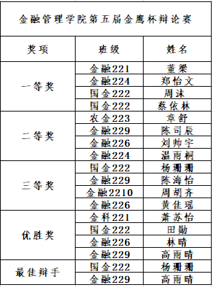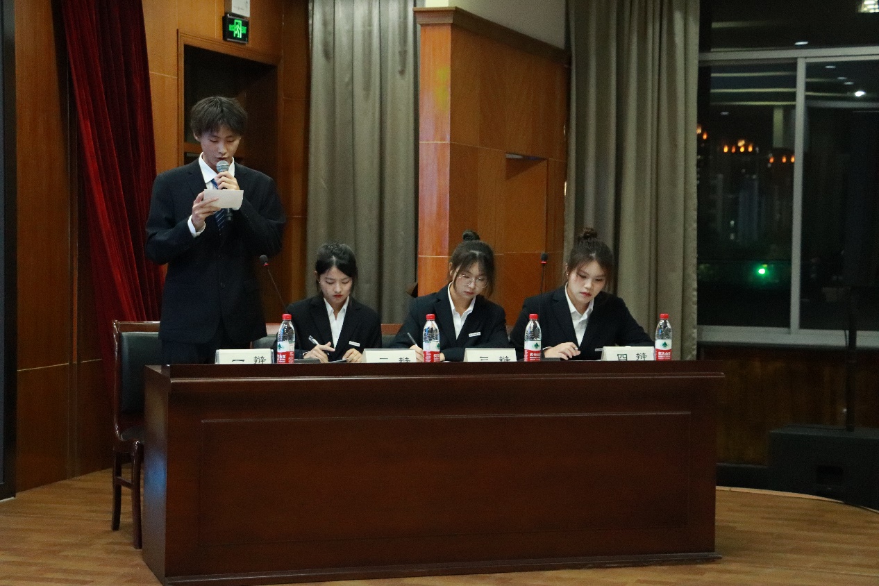 为促进学生的全面发展,进一步提高学生思辨综合素质。金融管理学院于11月8日晚在诚信讲学堂举行金融管理学院第五届金鹰杯辩论赛决赛,参加本次活动的有金融管理学院学工办辅导员石书敏、沈嘉辉、魏孝钿,金融管理学院20级辩论队领队季恒如、周小懿,21级辩论队领队吴伊杰,投资保险学院21级辩论队领队黄宗卿,国际商学院21级辩论队领队杨熠,以及通过层层筛选进入决赛的22级辩手。本次辩论赛由蔡雨露和杨泽涛主持。