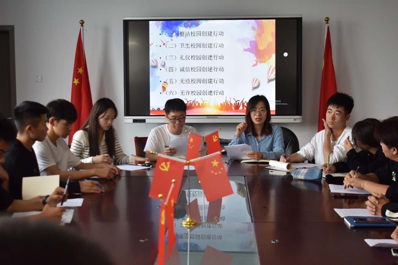 本次会议围绕整洁、卫生、礼仪、诚信、无疫、无诈这六个校园创建行动开展。首先石书敏从总体出发,讲解了本次文明校园的六个建设行动,以此来让同学们了解这次的创建行动并且让同学们体会到它的重要性。