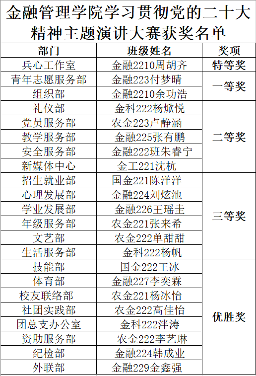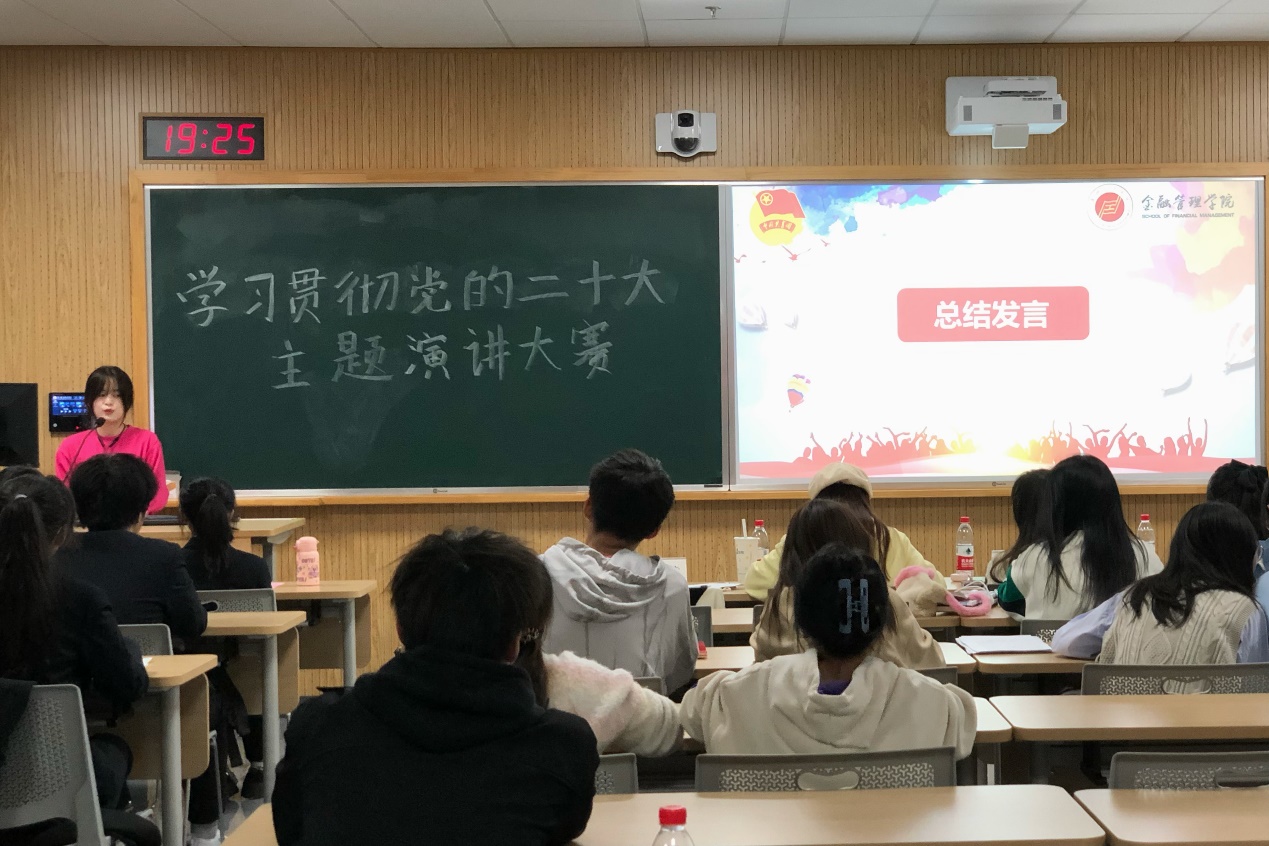 为进一步学习宣传党的二十大精神,让青年学子进一步感悟党的二十大精神,全面激发广大青年学习贯彻党的二十大精神的热情,我院于11月27日晚在泰隆303教室,举办以“学习贯彻党的二十大精神”为主题的第二届启航班干事演讲大赛。金融管理学院学生会执行主席郭琳琪、赵菲菲、项佳露以及金融管理学院团总支副书记徐祎、刘锶莹、卢佳莹出席本次比赛。