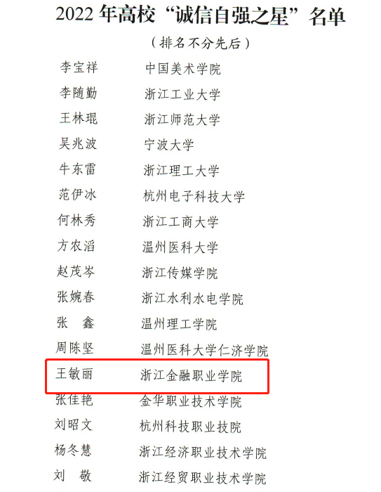 近日,浙江省教育发展中心公布2022年高校“诚信自强之星”,根据《关于大力开展2022年高校学生资助诚信教育“诚信自强之星”主题活动的通知》,此次主题活动旨在筛选我省广大优秀学子中的典型代表,经高校推荐、专家评审,确定20名同学为2022年高校“诚信自强之星”,我院金融20(1)班王敏丽获此荣誉称号。