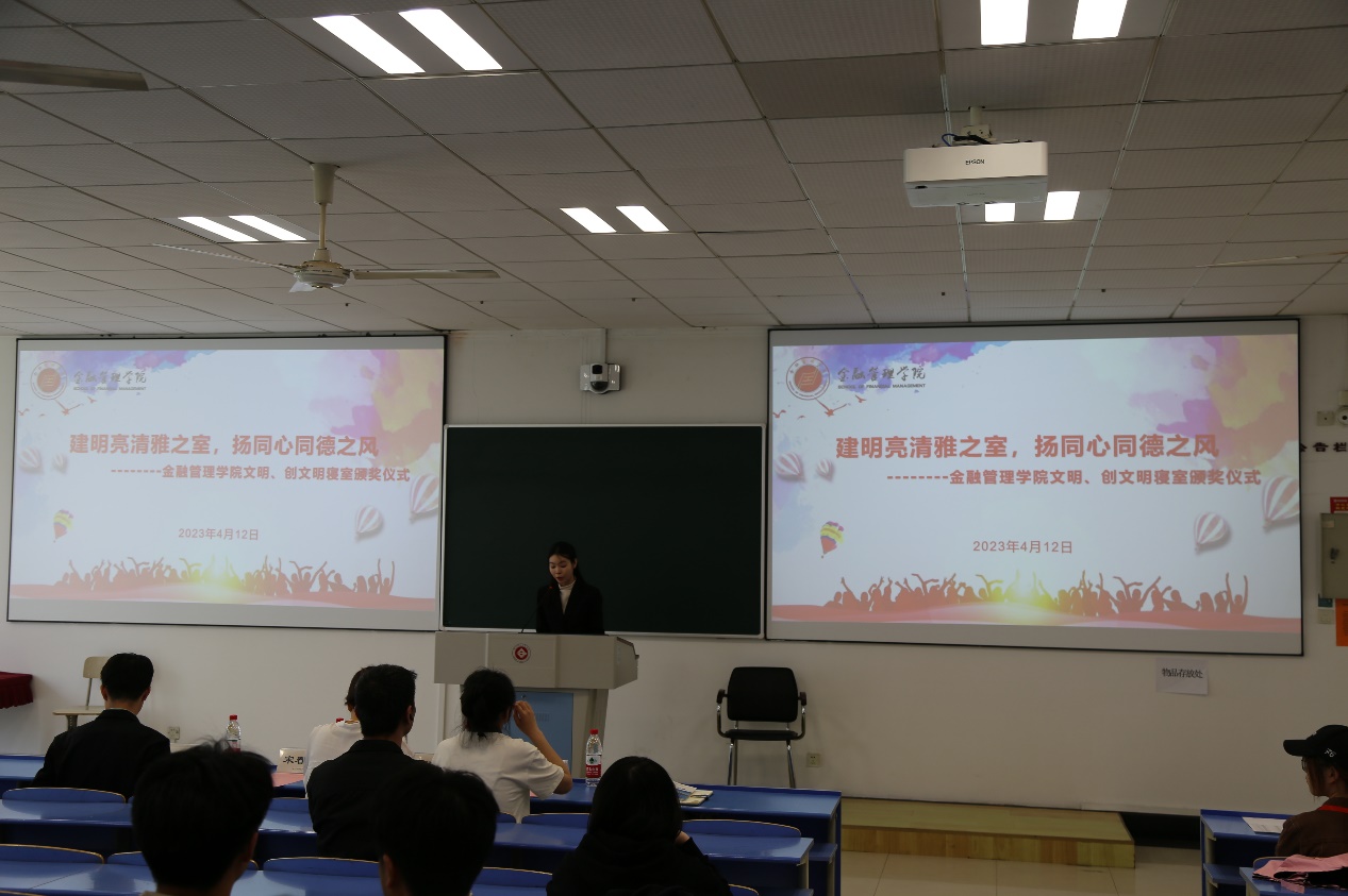 为“建明亮清雅寝室,扬同心同德之风”,金融管理学院于4月12日下午在8319举行“金融管理学院文明、创文明寝室表彰大会”。金融管理学院学工办副主任宋春旗,辅导员石书敏、程丽、魏孝钿,学院文明寝室、创文明寝室代表,21级、22级班长,22级寝室长参加本次表彰大会。本次表彰大会由钱瑜主持。