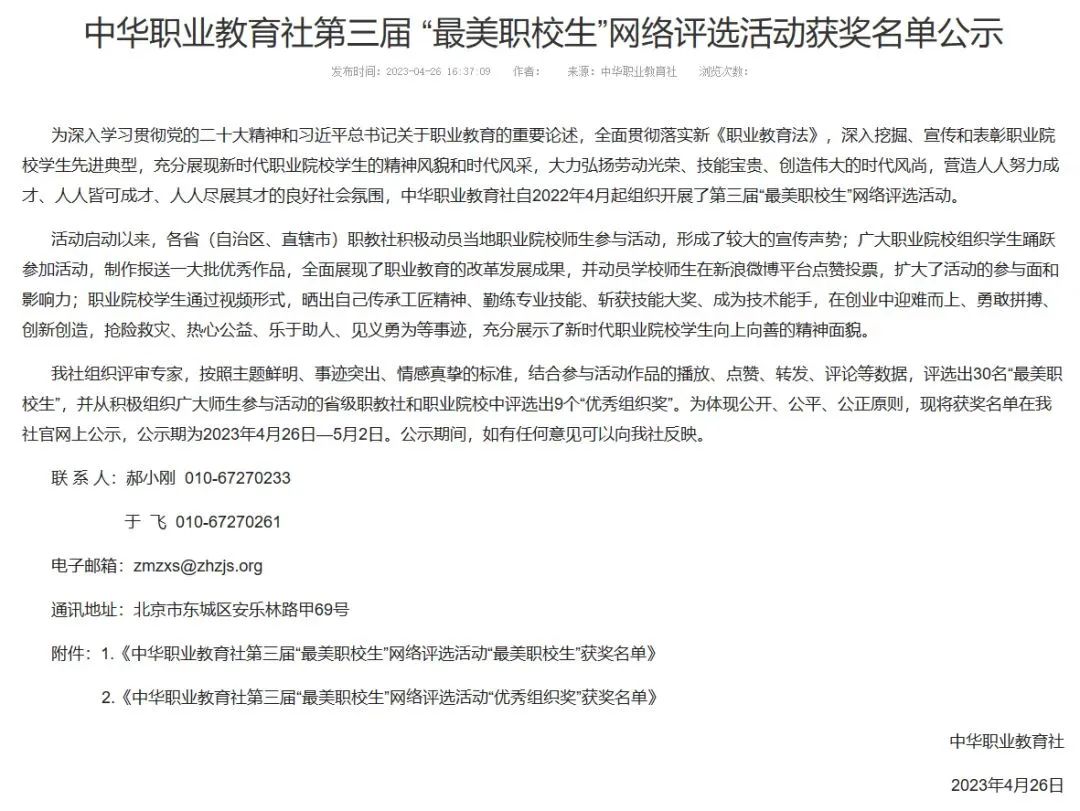 5月2日,由中华职业教育社举办的第三届“最美职校生”网络评选活动结果出炉,浙江金融职业学院金融管理学院金融2010班、银领学院萧山农村商业银行191班的俞益施被授予“2022年最美职校生”荣誉称号。