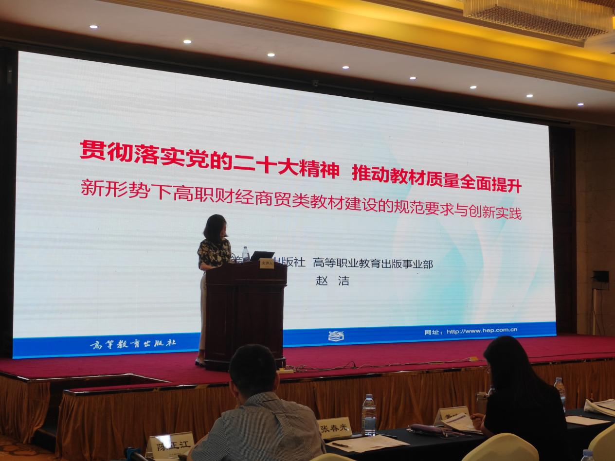 高等教育出版社高职事业部首席编辑赵洁发表了题为“贯彻落实党的二十大精神 推动教材质量全面提升”的主旨演讲,分别从坚定不移讲政治、旗帜鲜明讲类型、守正出新讲创新和与时俱进讲融合四个方面展开。