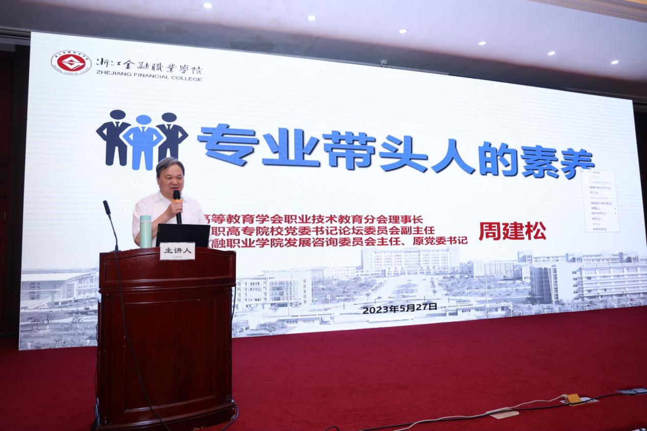 全国金融行指委副主任委员、浙江金融职业学院发展咨询委员会主任周建松教授发表了题为“论专业带头人的素养”的主旨演讲,他提出,专业带头人的培养应该成为职业学校师资队伍建设的重中之重,也应该成为职业学校管理队伍建设的重要途径,培养和造就一大批强有力的专业带头人成为当务之急、长远之计。他从专业带头人的政治素养、专业素养、政策素养、管理素养、教研素养和基础素养等六个方面进行了阐述。最后他总结到,专业带头人是一个十分综合全面的角色,一个优秀的专业带头人,可谓人才难得,对于学校事业发展来说,可谓一才难求。专业带头人首先应该是好老师,要按照好老师标准,加强教师修养,提高教研和育人能力。专业带头人也是一个好的管理者,要丰富政治、政策和管理素养,提高团队管理能力,建设高水平结构化双师型教学创新团队。