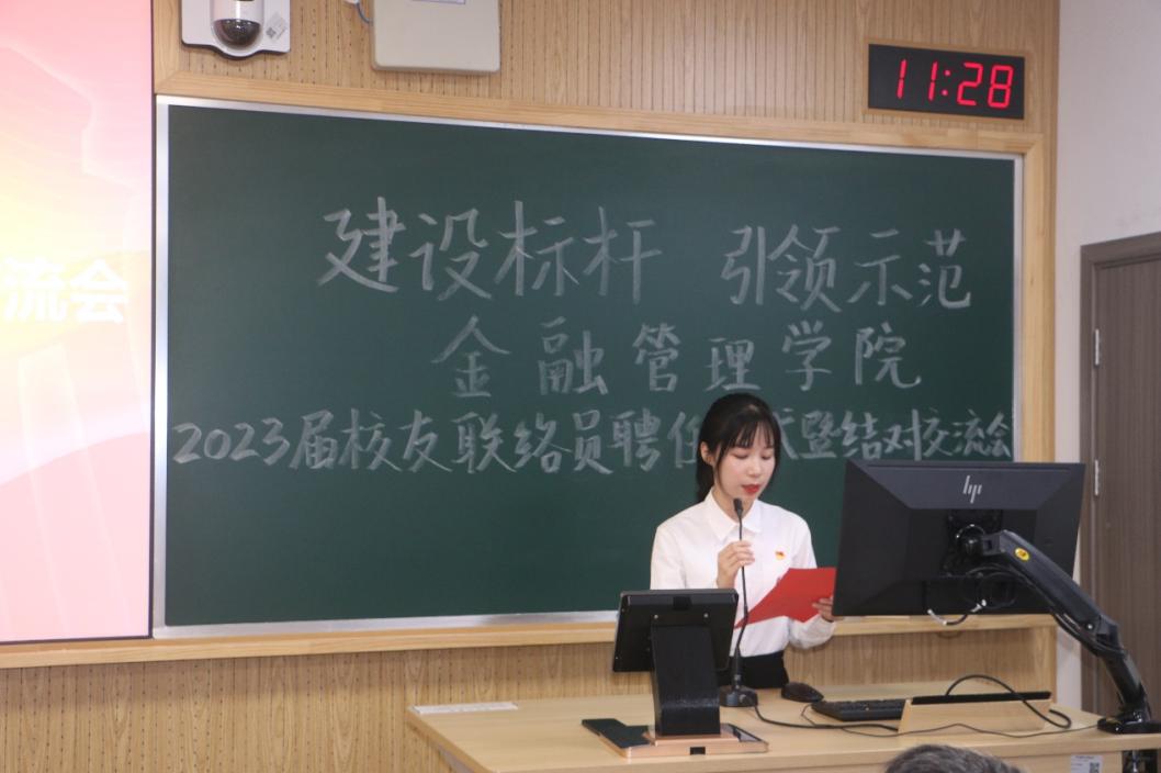 为进一步密切毕业生与母校之间的联系,促进学校和校友事业的共同发展。金融管理学院于2023年6月7日上午,在泰隆109教室召开“建设标杆 引领示范”金融管理学院 2023 届校友联络员聘任仪式暨结对交流会。金融管理学院院长董瑞丽,学院党总支书记、副院长钱利安,学院党总支副书记吴小燕,学院2023届班主任代表龚梦雪,学院学工办副主任宋春旗,辅导员夏佳颖,学院2023届校友联络员参加此次会议。本次会议由国金222李甄卿主持。