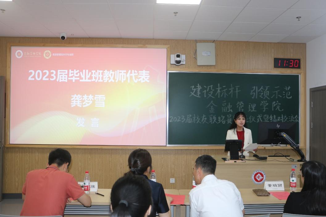 接着,毕业班教师代表龚梦雪发言,她表示校友有缘分,三年情谊凝聚在此,造就团结奋进的集体,希望全体校友联络员继续团结凝聚班级同学力量;校友有责任,希望全体校友联络员积极承担责任使命,切实做好各项校友工作,支持母校工作,进服务好校友与母校发展;校友有传承,希望全体校友秉持校训要求,大力发扬朋辈互助精神,传承并弘扬工匠精神,助力金院学子成长成才。