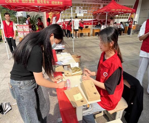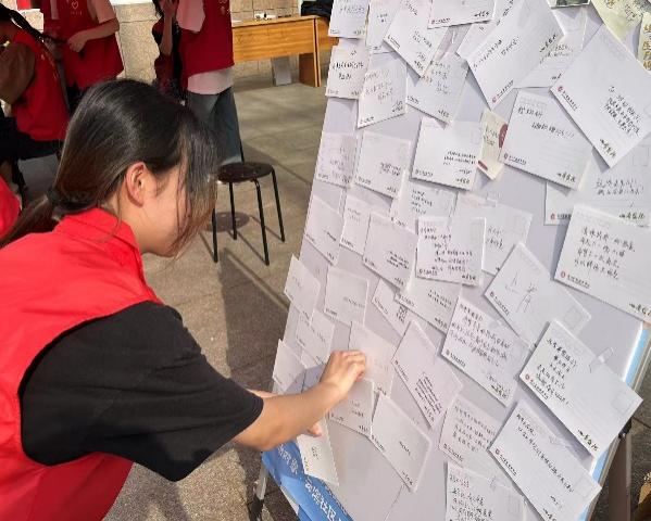 志愿者们身穿红马甲,手持明信片,热情邀请毕业生书写明信片,一张张明信片寄托着毕业生们对学校、对老师、对宿管阿姨、对保安叔叔的深切祝福。一张张明信片,再现了毕业生在学校的点点滴滴,编织了他们三年的珍贵青春记忆。殷殷祝福,纸短情长。