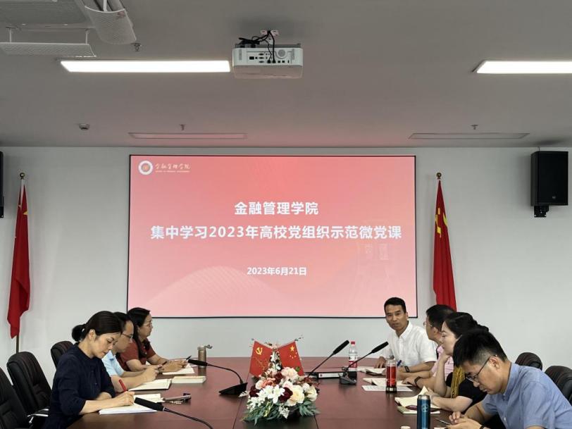 为推进学习贯彻习近平新时代中国特色社会主义思想主题教育,6月21日下午,金融管理学院组织全体教师在泰隆718会议室,集体收看学习2023年高校党组织示范微党课展播内容,活动由党总支书记钱利安主持。