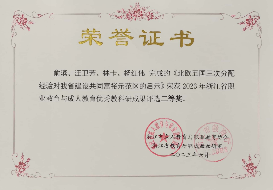 日前,我院俞滨、汪卫芳老师联合浙江大学、浙江财经大学完成的研究成果《北欧五国三次分配经验对我省建设共同富裕示范区的启示》,经个人申报、各会员单位审核限额推荐、专家评审、网上公示,荣获2023年浙江省职业教育与成人教育优秀教科研成果奖二等奖。
