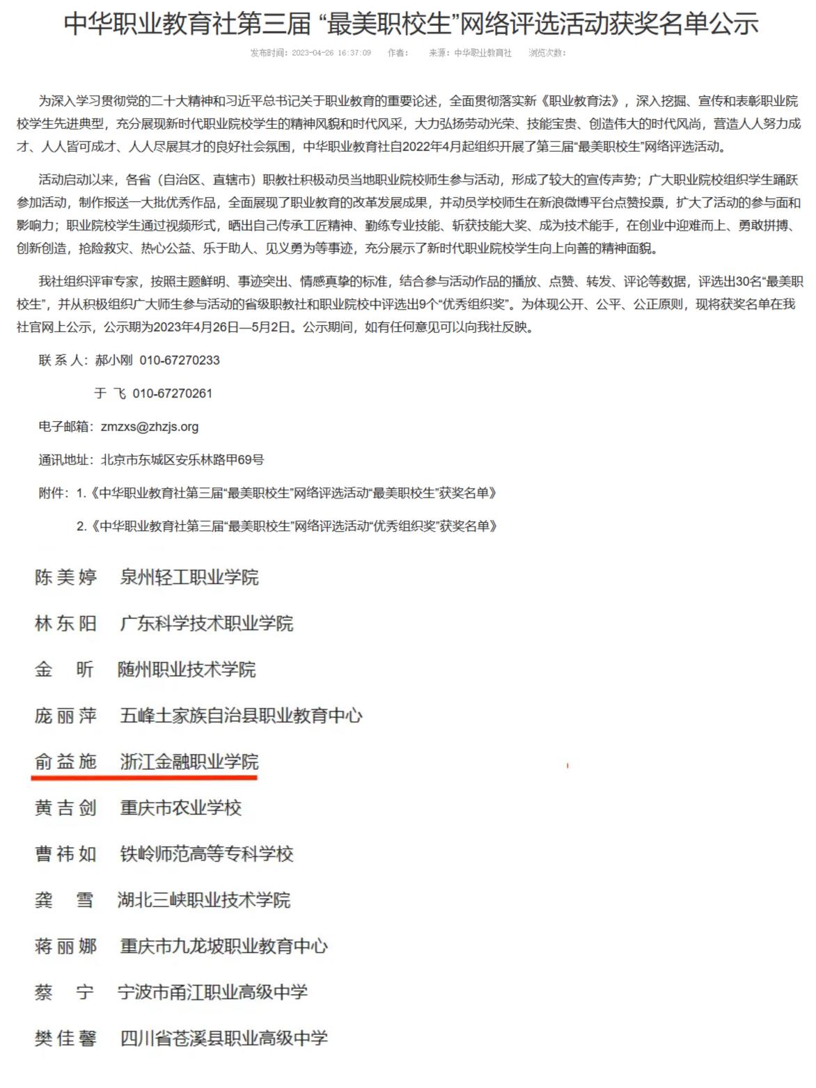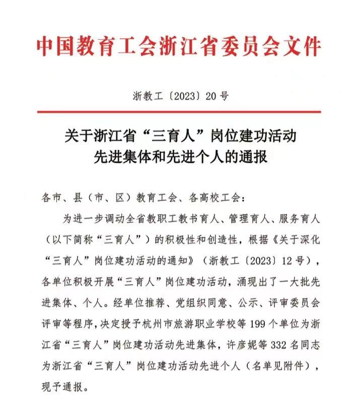 9月1日,浙江省教育工会发布了《关于浙江省“三育人”岗位建功活动先进集体和先进个人的通报》(浙教工[2023]20号),我院荣获浙江省“三育人”岗位建功活动先进集体称号。