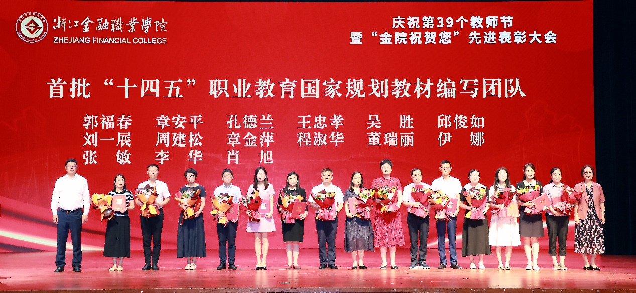 学校党委书记金杨华、校长郑亚莉为学校首批“十四五”职业教育国家规划教材编写团队颁奖,学院邱俊如老师代表团队上台领奖。