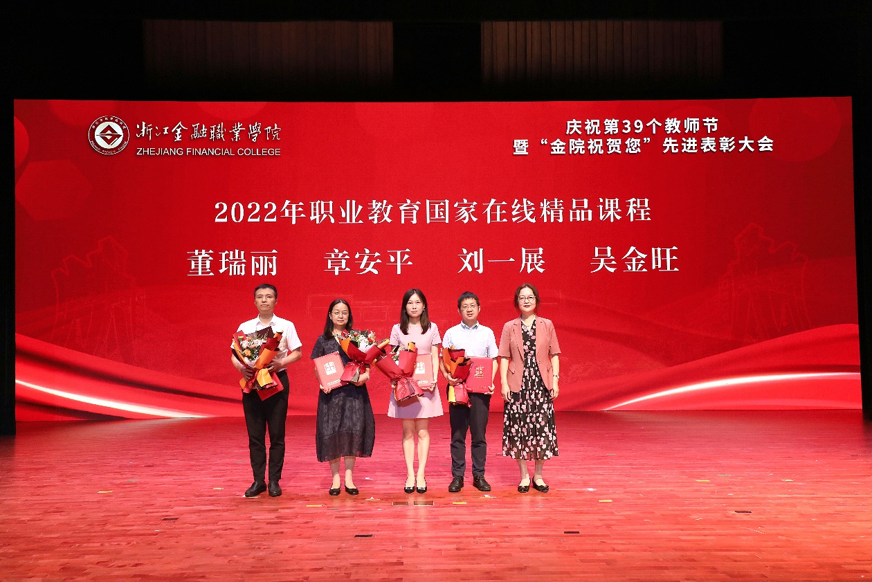 学校校长郑亚莉为2022年职业教育国家在线精品课程获奖团队颁奖,学院吴金旺老师代表团队上台领奖。
