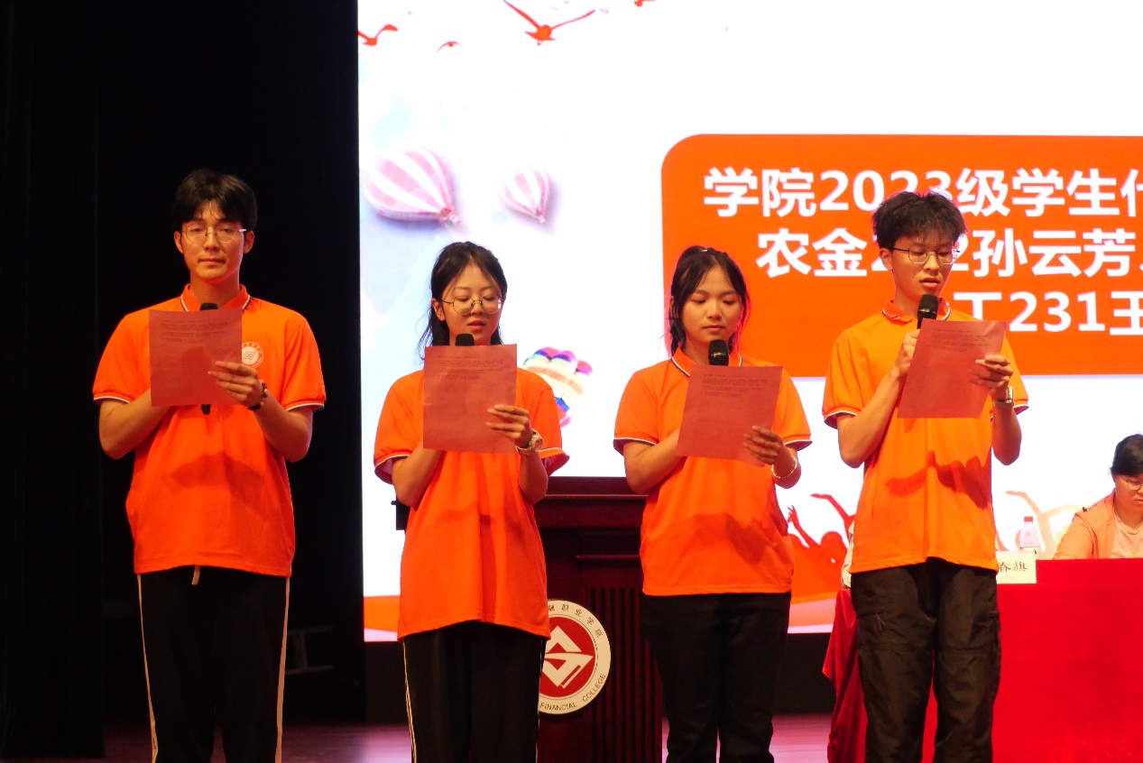 大会最后一项议程,23级学生代表金融235汤佳辉、农金232孙云芳、国金232方雨萱、金工231季昕跃发言。他们表达了全体新生将“不负韶华,奋勇向前,无畏追梦,创造更辉煌的明天”的志向。