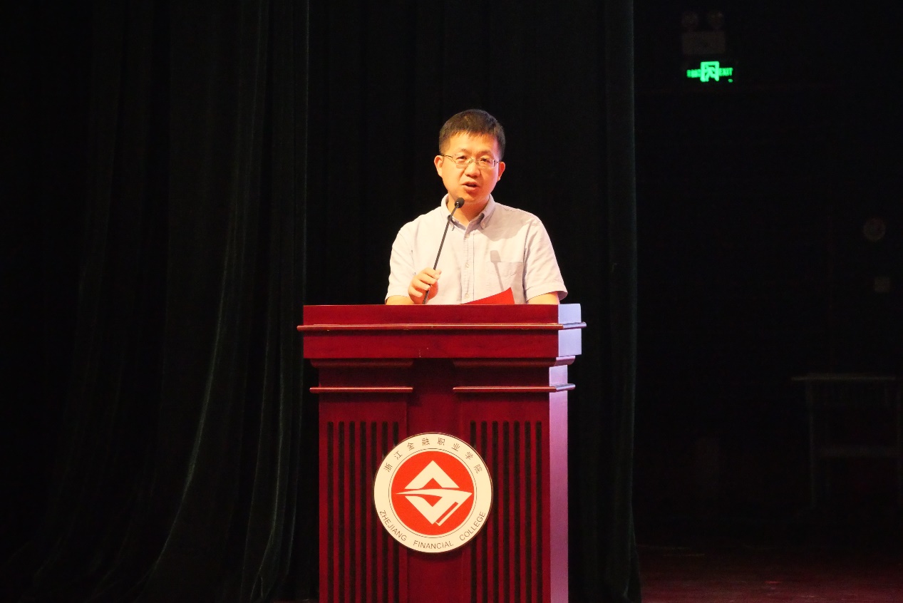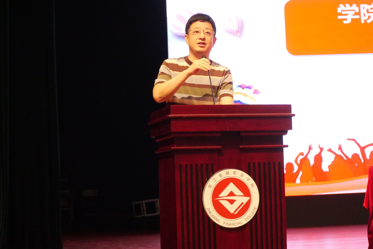 随后,吴金旺介绍学院概况并做迎新致辞。他分别从学院各专业优势、师资团队和教学场所介绍学院概况。他围绕政治性、普惠性和专业性概括金融行业特征,希望全体同学正确认识自身专业并始终保持学习热情,更好的服务于社会经济发展。他表示学院师资力量雄厚,教学环境优良,拥有2个国家级教学资源库,学院致力于打造浓郁的金融文化、诚信文化和校园文化的氛围,同时金融管理学院围绕着知识学习、技能训练、能力培养和综合素质四大主题实施专业素质提升计划,希望全体新生积极发挥学习主动性,用好用活学院教学资源。最后,吴金旺深切期望同学们能在秉持学校“披沙拣金,融会贯通”的校训的同时,重视体质健康,在课余放下手机,抬头看路,仰望星空,勤加锻炼,保持自己的身心健康。