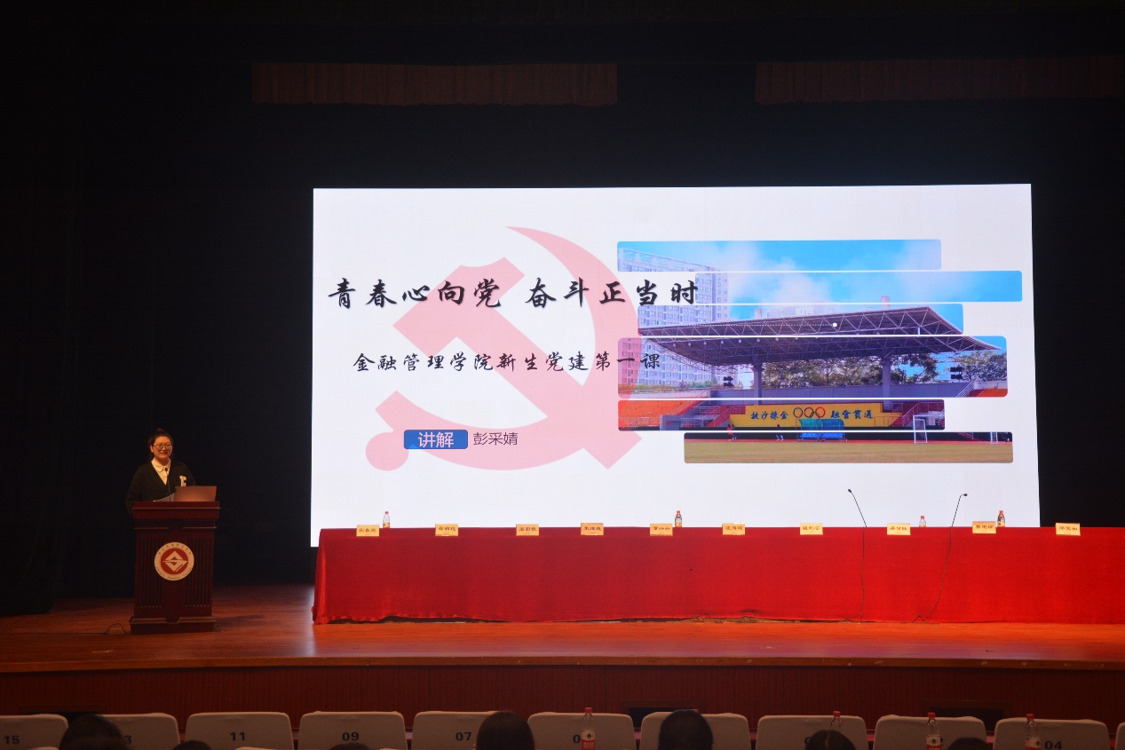 第四阶段,彭采婧以“青春心向党,奋斗正当时”为主题,开展新生党建第一课。活动中,她向学生们详细介绍了入党流程,端正学生入党动机,并对入党申请书的撰写注意事项进行强调。同时就学院推优情况与党员概况进行介绍,她希望每一位同学都能积极向党组织靠拢,争做新时代青年。