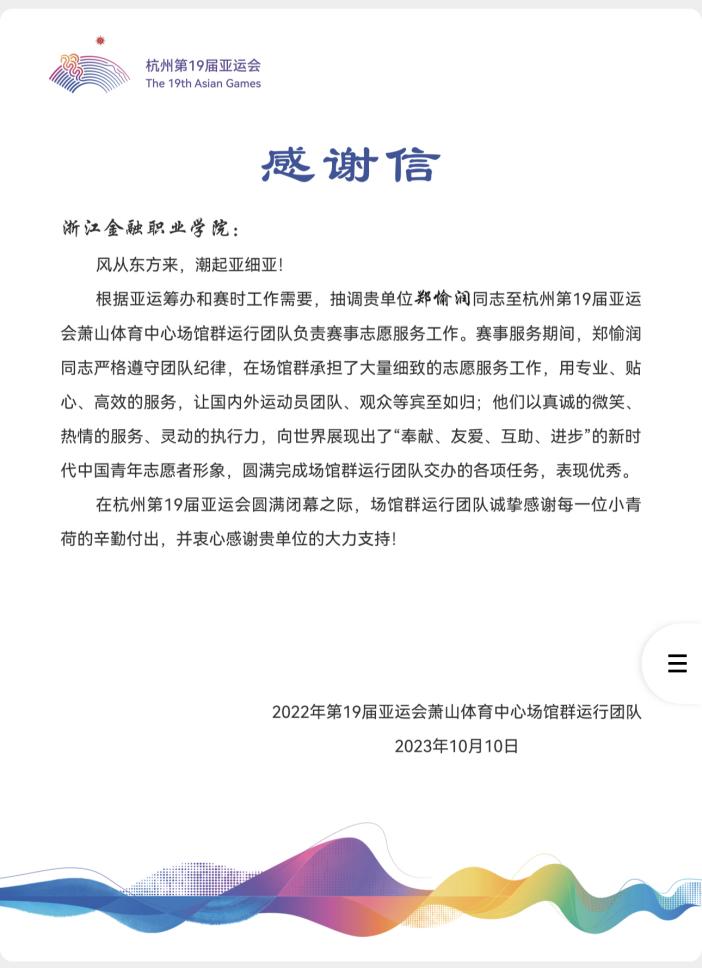 他说,非常荣幸能够成为杭州亚运会志愿者的一员,作为亚运会志愿者,我深深的感受到了团结、友爱、互助、进步的志愿者精神。在亚运期间,我与来自不同领域的志愿者们一起工作、一起进步,学到了很多专业知识和技能,也结交了很多志同道合的朋友,这次的经历必将终生难忘。亚运会已经结束,但我会在今后的生活和学习中,严于律己,继续发扬志愿精神。