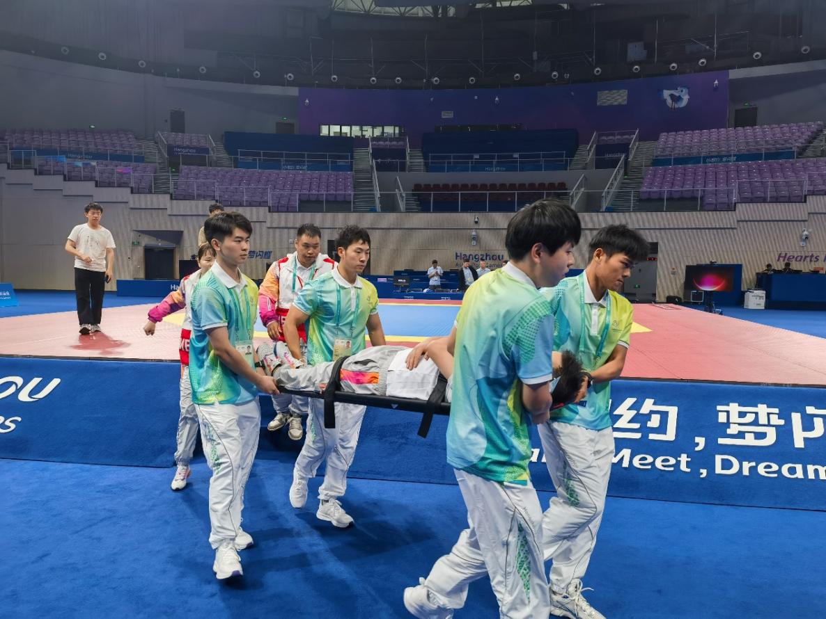 作为医疗协转志愿者,他们早上6点就赶赴场馆,直至所有比赛结束方能离开。面对高强度的工作,他们全神贯注地关注场上的动态,遇到突发情况,迅速出动,协助医生完成转运工作,展现了退役士兵的优良作风和金院青年的精神风貌。