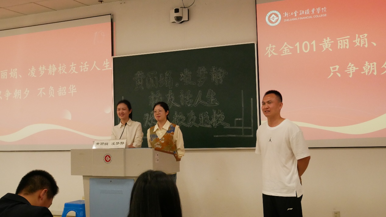 11月4日上午,金融管理学院有幸邀请到学院优秀校友,现任杭州联合银行高级客户经理黄丽娟校友,杭州联合银行营业厅经理凌梦静校友,在8219教室开展以“只争朝夕,不负韶华”为主题的校友话人生活动,学院学生参加此次活动,本场活动由学校教师靖庆磊主持。