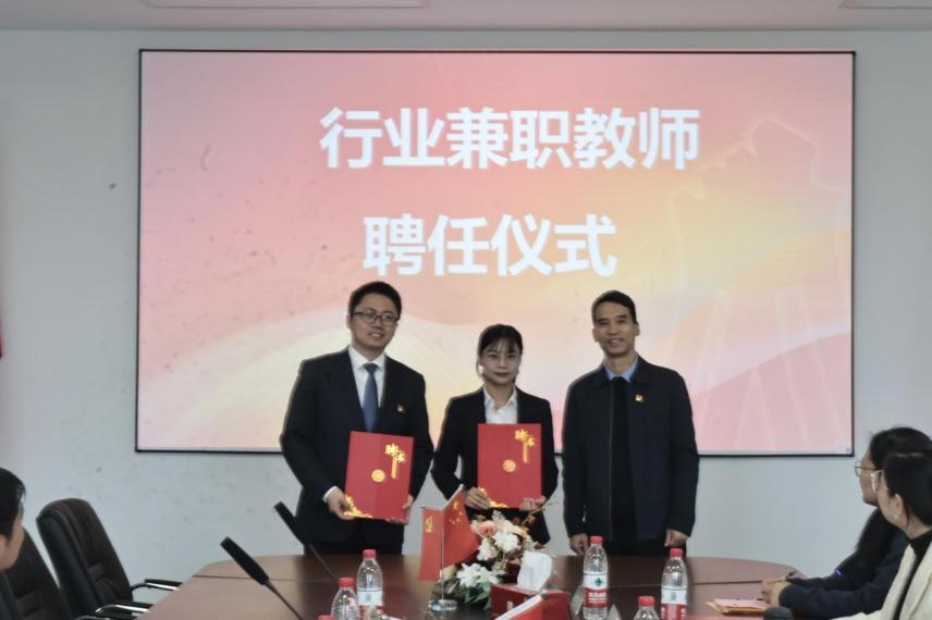 钱利安(右一)向张璐萍(中间)、王柯(左一)颁发学院聘书