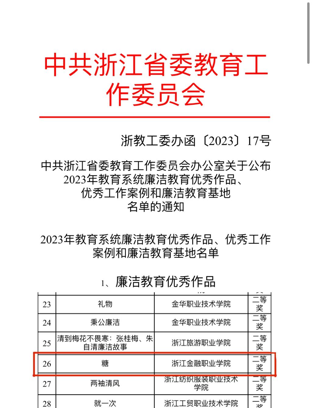 为了进一步深化清廉学校建设,加强新时代校园廉洁文化建设,引导师生干部夯实清正廉洁思想根基、厚植廉洁奉公文化素养、培养廉洁自律道德操守、弘扬崇廉拒腐社会风尚,不断增强廉洁治校、廉洁从教、廉洁育人、廉洁修身意识,纵深推进教育系统全面从严治党,为推进中国式现代化教育示范省建设贡献力量。由我院教师沈嘉辉指导,金融216班王舒琦、农金213班吴佳佳拍摄的《糖》以出色的表现和独特的创意获得了廉洁教育优秀作品视频类二等奖的好成绩!