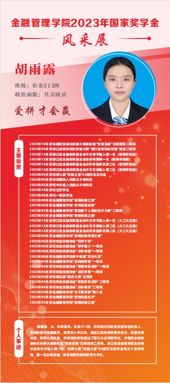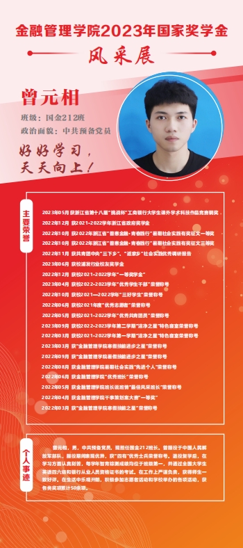 近日,2022-2023学年国家奖学金评审结果公布,热烈祝贺我院国金212班曾元相、金融214李晶晶、农金212胡雨露三位同学荣获2022-2023学年国家级奖学金。三位同学优秀事迹如下: