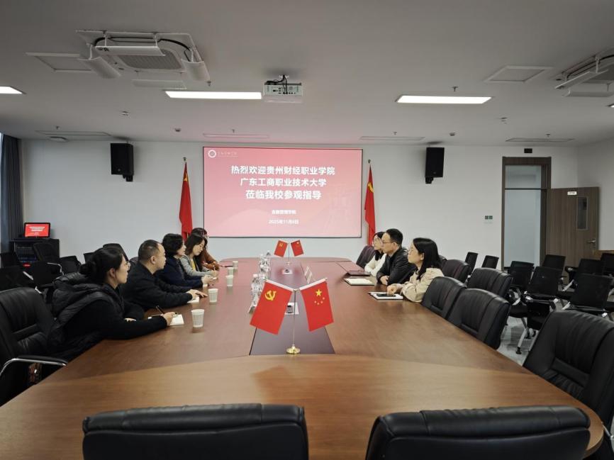 2025年11月6日下午,贵州财经职业学院财政金融系党支部书记石林艳一行3人、广东工商职业技术大学财经政法学院金融管理教研室主任敬翠华一行2人来我院交流。金融管理学院副院长凌海波进行了热情接待,并就金融类高职专业人才培养等进行了深入交流。金融教研室主任邱俊如、金融科技应用专业俞静婧老师参加了会谈。