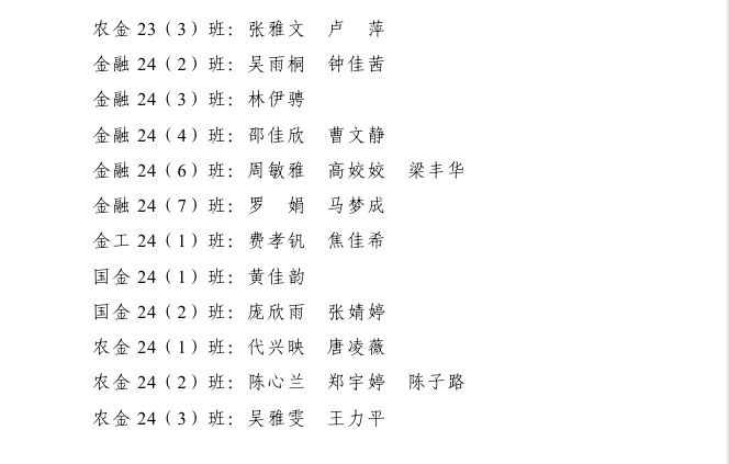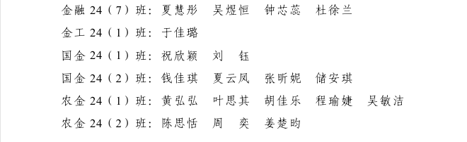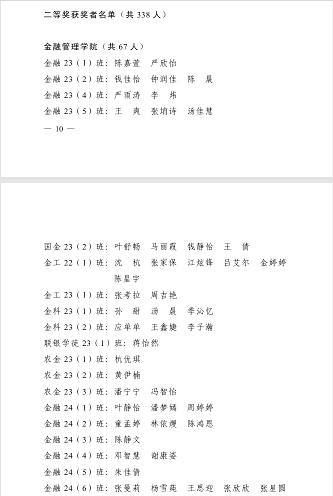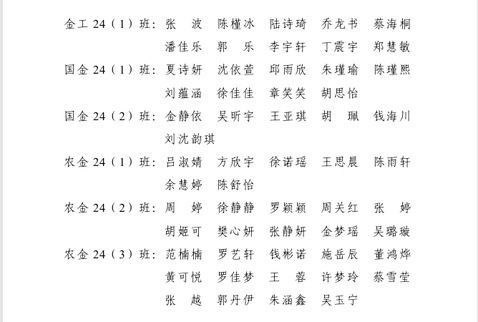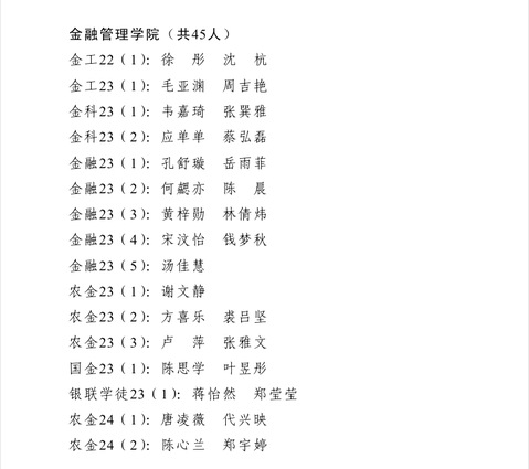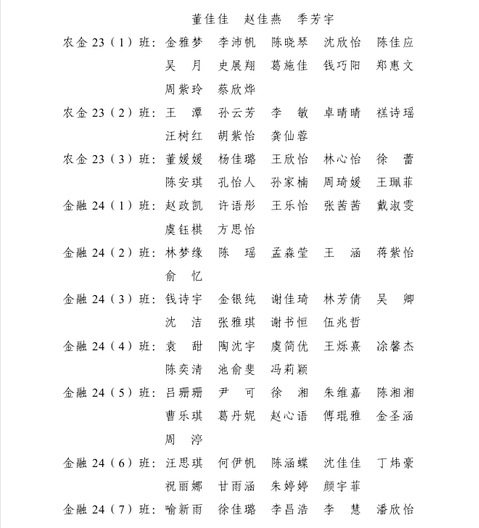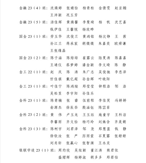 根据《浙江金融职业学院学生荣誉称号评比条件及管理办法》的规定,经各班级认真评比推荐,各学院审核并公示,学校学生工作委员会审定,决定授予我院以下45位同学2024-2025学年“三好学生”荣誉称号: