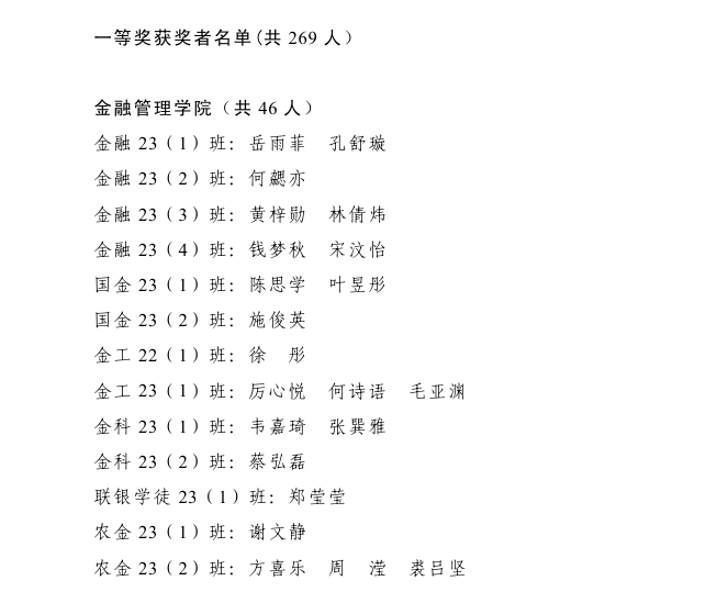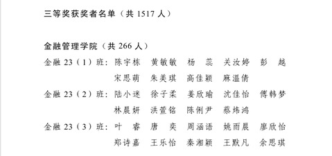 为嘉奖优秀、立典示范,进一步厚植学院“奋发向上、笃学善思”的学习氛围。根据《浙江金融职业学院学生奖学金评定条件及管理办法》的规定,经本人申请,各班级推荐,各二级学院审核并公示,学校学生工作委员会审定,金融管理学院共有46名学子获得了校内优秀学生一等奖学金,67名学子获得了校内优秀学生二等奖学金,266名学子获得了校内优秀学生三等奖学金。具体名单如下: