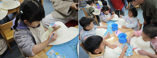 志愿者以“奶奶的百宝箱”为引,通过动画展示与互动问答,带领孩子们走进奇妙的草编世界。从古人用草编鞋护脚、编帽遮阳的智慧,到现代生活中草编艺术的环保价值,孩子们在聆听与观看中,感受到自然材料焕发出的生命张力。随后,孩子们手持草帽,运用环保颜料,在帽檐上自由挥洒创意。一朵朵小花、一道道彩虹、一个个可爱的图案跃然“帽”上,原本朴素的草帽逐步变成了独一无二的艺术品。