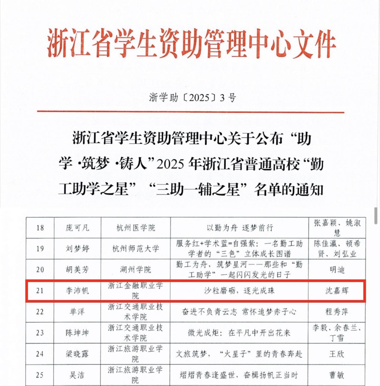 近日,浙江省学生资助管理中心关于公布“助学·筑梦·铸人”2025年浙江省普通高校“勤工助学之星”“三辅一助之星”名单的通知(浙学助〔2025〕3号)。经高校推荐、专家评审,我院学子在此次评选中表现亮眼,农金231李沛帆同学荣获浙江省普通高校本专科生“勤工助学之星”优秀个人典型,充分彰显了我院学子自立自强、诚信励志的精神风貌。